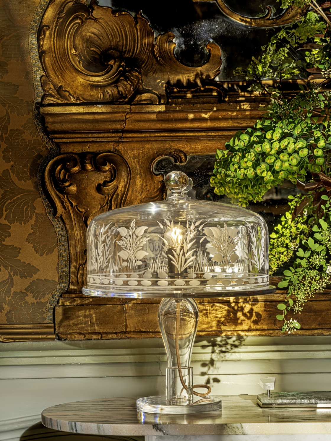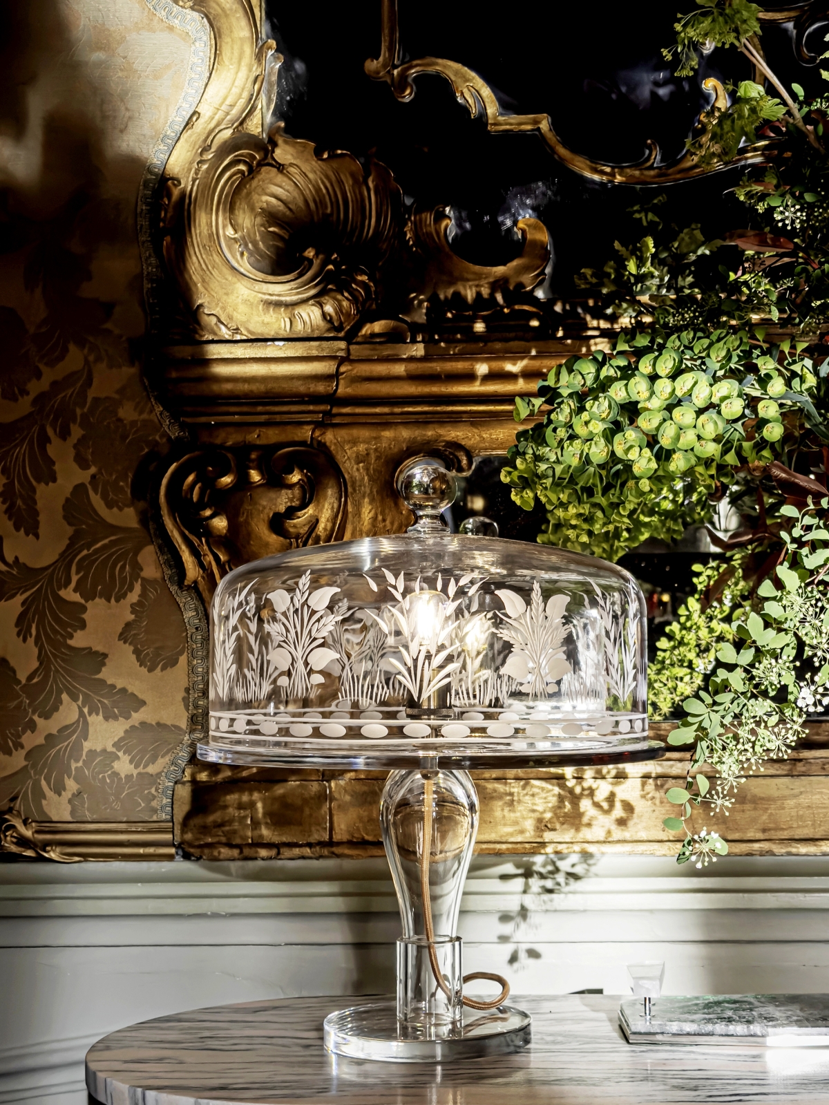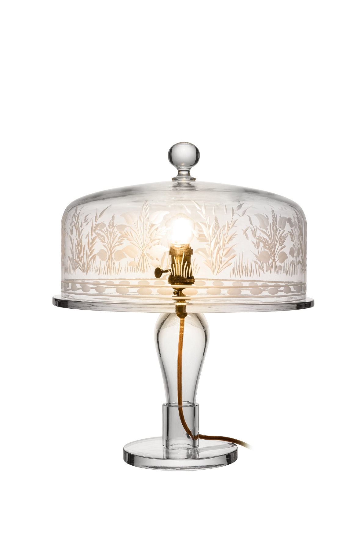 Artful and inspiring, the Cake Lamp is handmade in Italy from hand-etched crystal. It has a single vertically positioned bulb to cast even light from the center. When illuminated, the top comes to life, warming the room with soft light and playful shadows. The functional top is also removable so objects and precious treats can be uniquely displayed on the flat plate within a dome of light.
