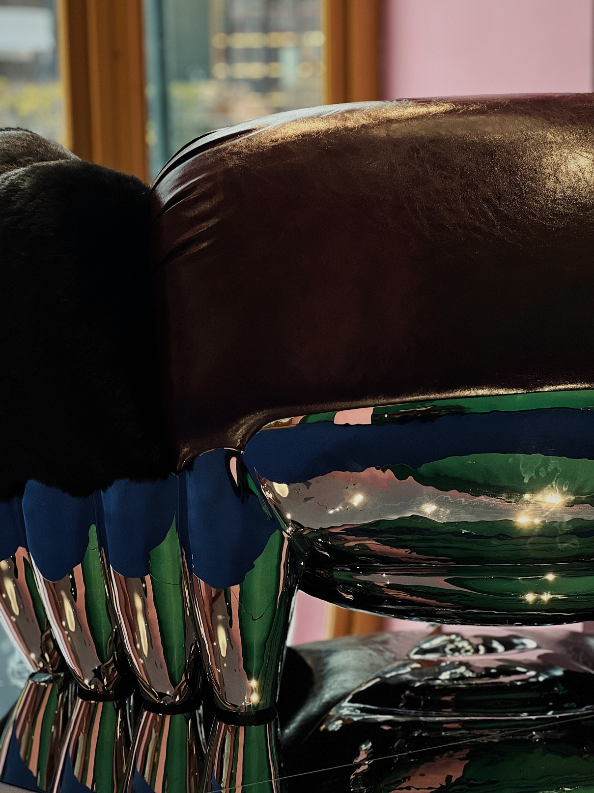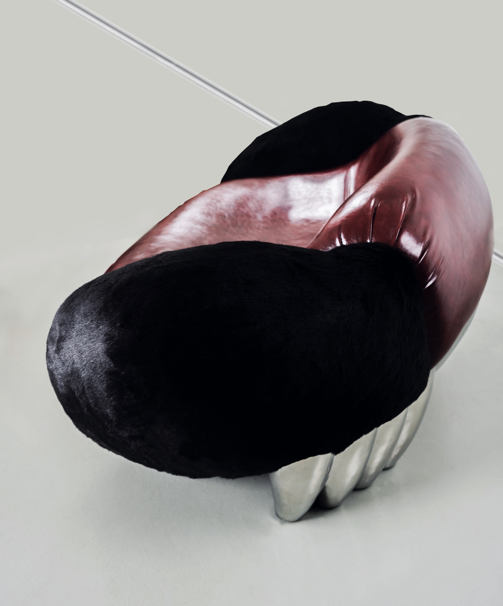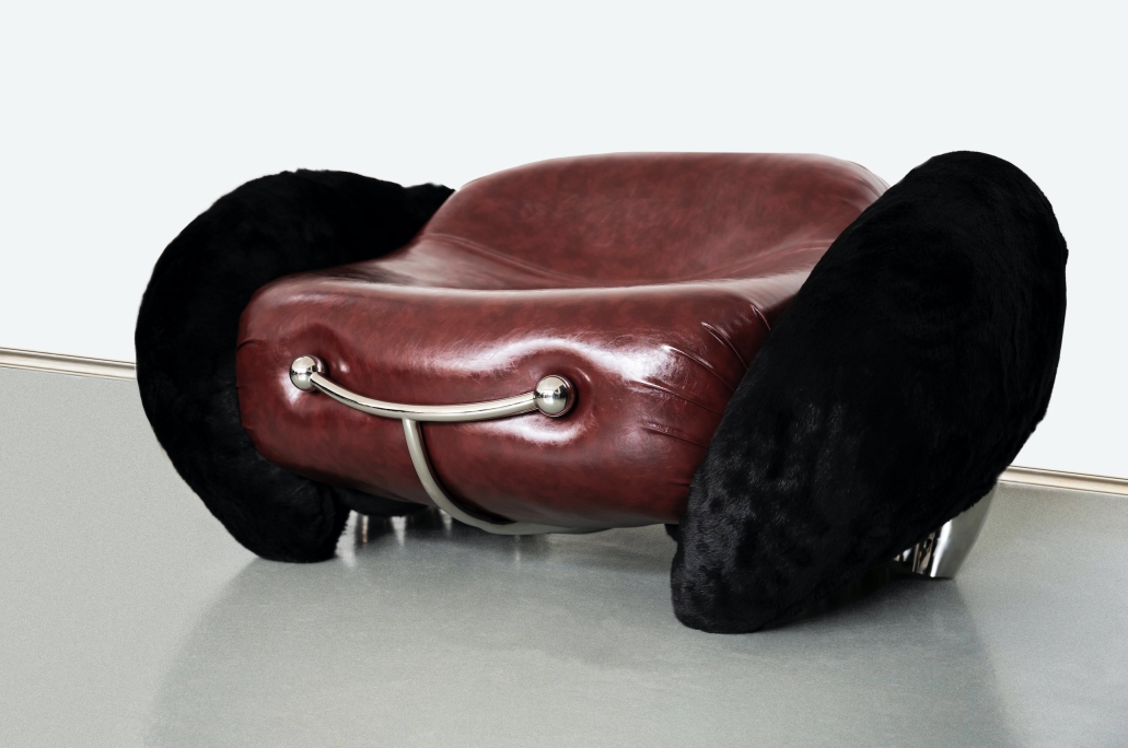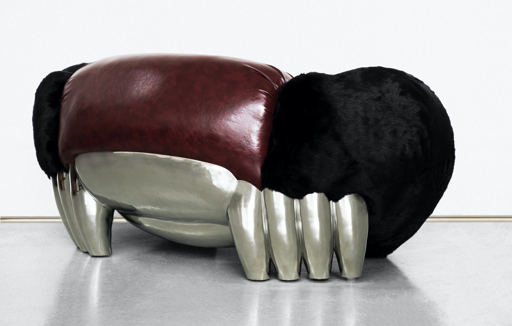 Embracing the deep burgundy hues of the crab's shell, the sofa creates an immersive, dark-red experience reminiscent of the crustacean's underwater habitat. Crafted from metal, leather, and faux fur, it seamlessly blends comfort and style, offering a plush seating experience.