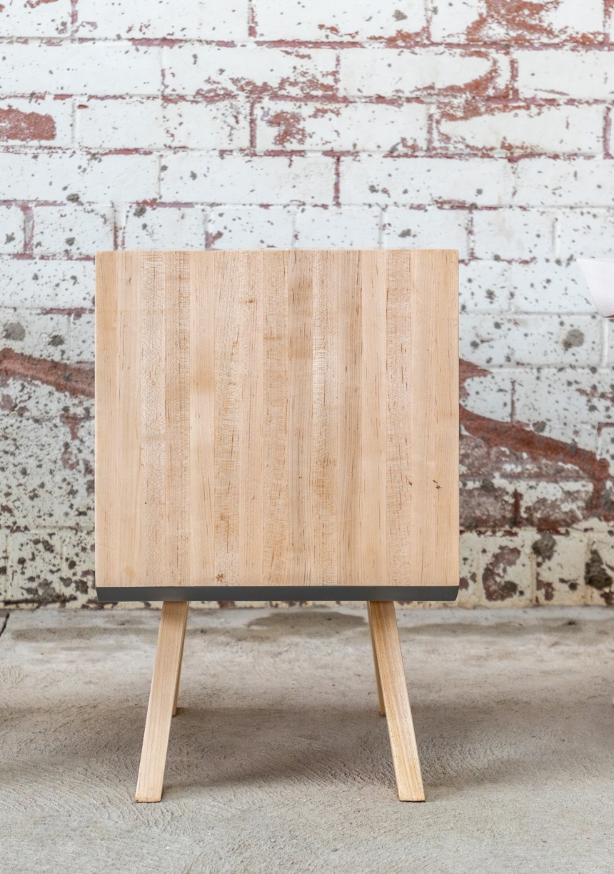 Fabricated by sustainable forests in Canada, this solid maple volume is a cube deconstructed. With its simple square shape on one side floating over thin profile legs and its contrasting fluid cutout on the opposing side, this piece of furniture is a conversation between the fluid and the rigid, the line and the curve, and the male and the female. The drape of seat balances over the structure of the legs in a manner that defies expectations of stability, yet is unmoving in its grounding.
