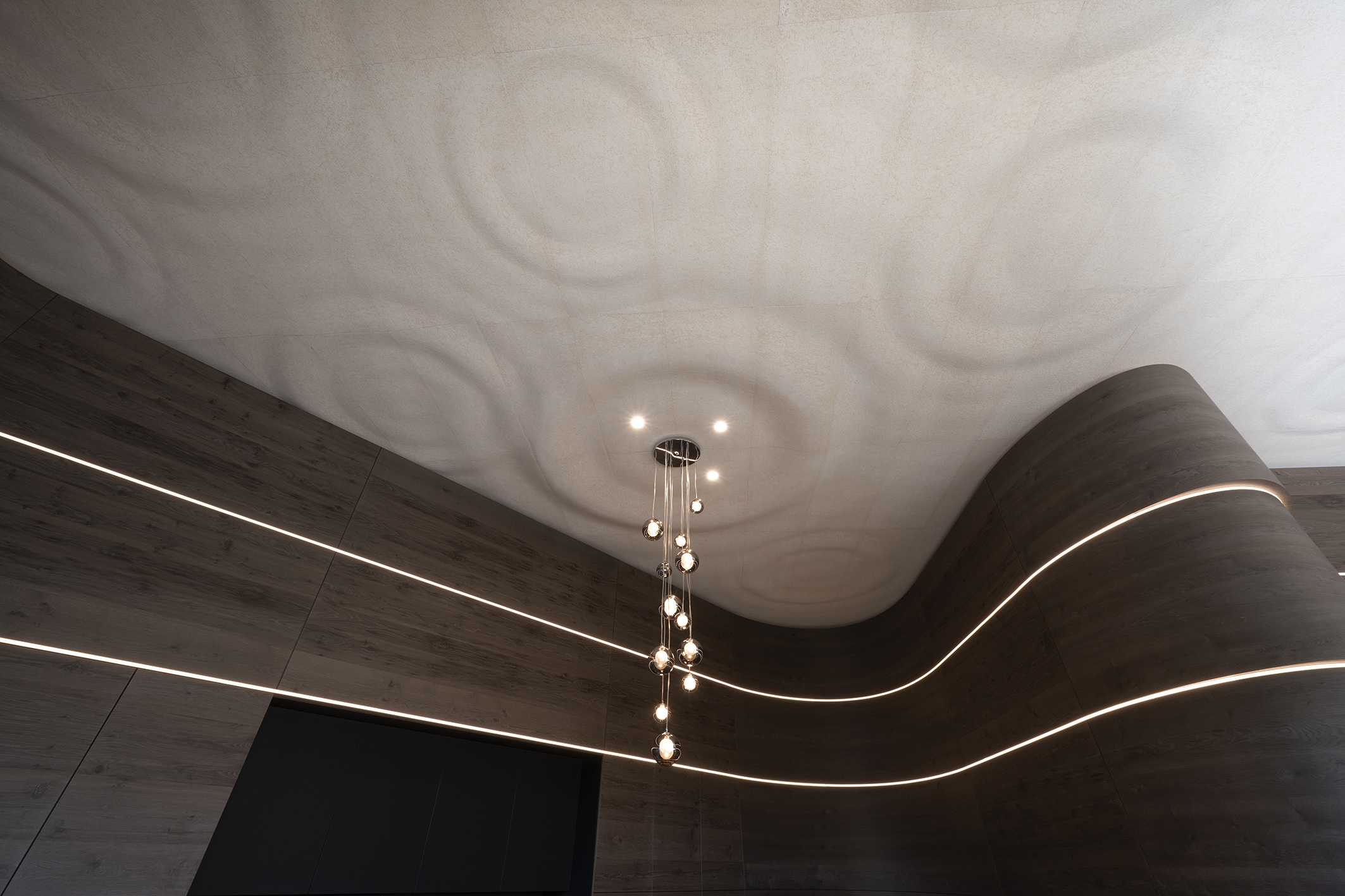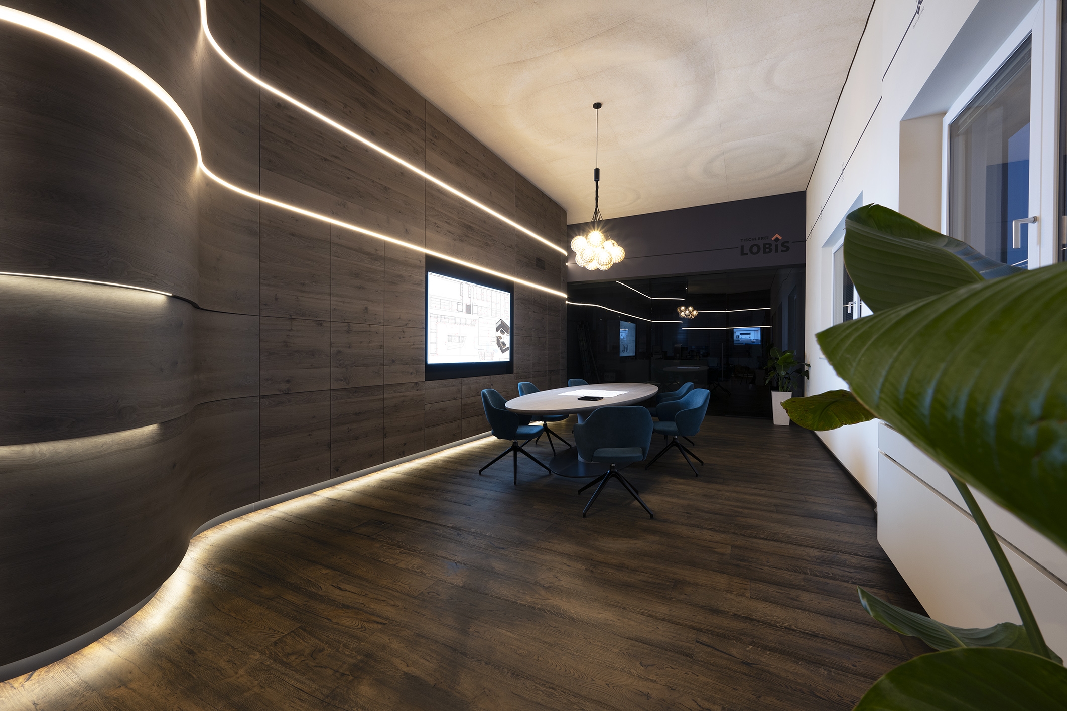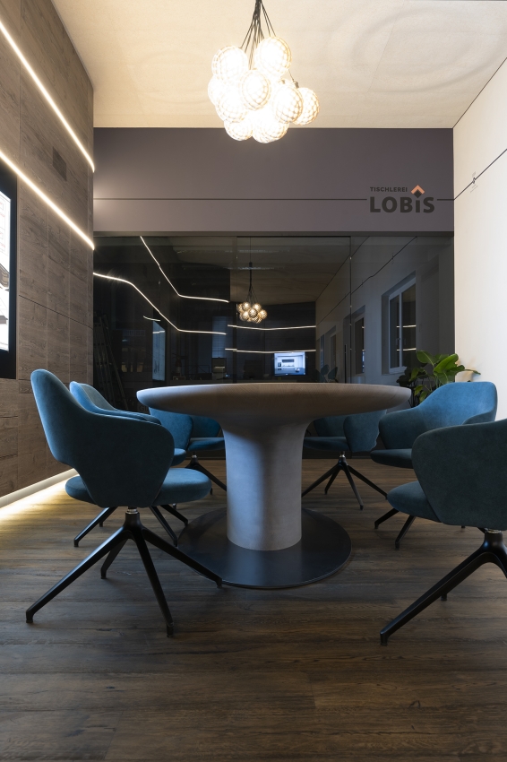 The small meeting room exemplifies our carpentry expertise, harmonizing tradition, innovation, and sustainability. Its theme, "Panta Rhei – Everything Flows," inspired by Heraclitus and Goethe, reflects the perpetual state of change. Flowing lines guide the visitor's eye, creating a dynamic sense of movement. The CNC-milled ceiling resembles a calm water surface, with the gentle rhythm of raindrops enhancing the visual experience and reinforcing the concept of flow.
