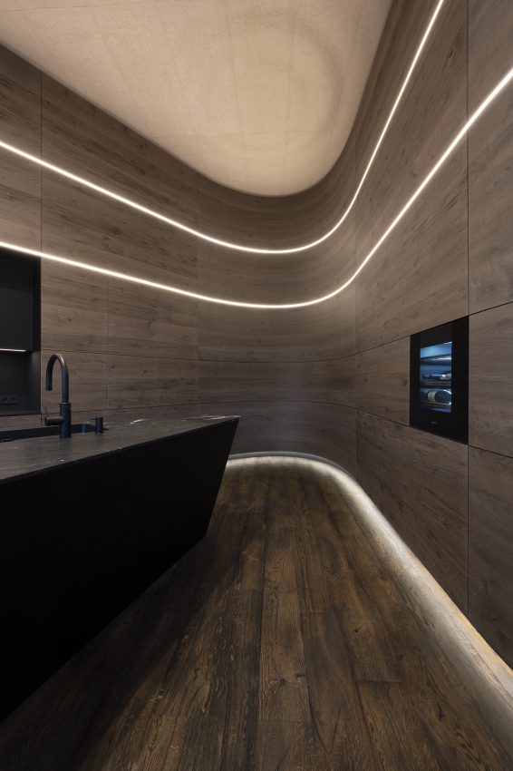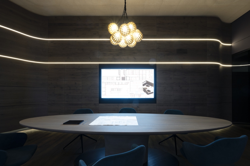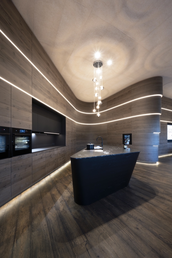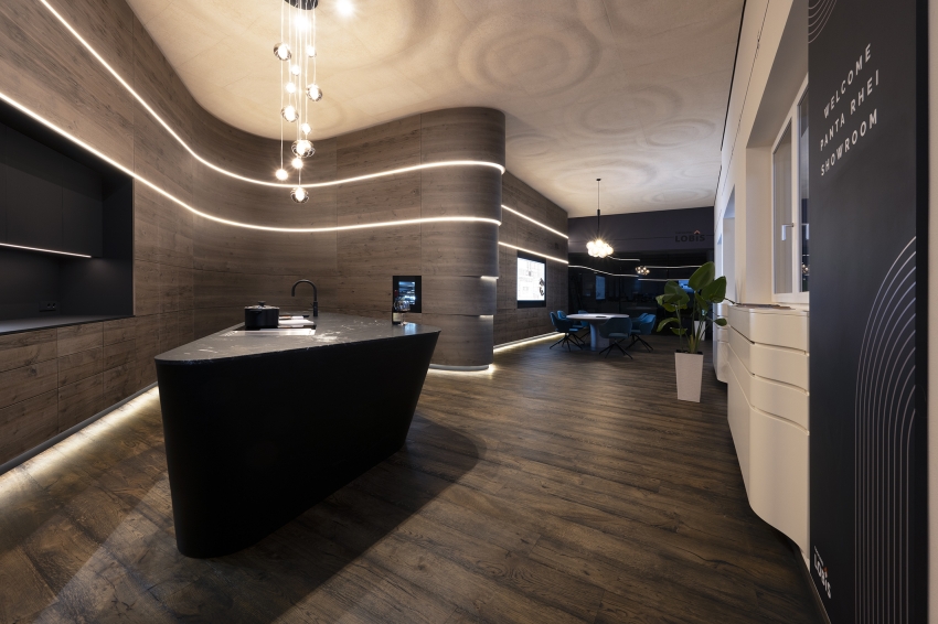 At the heart of the room is a conference table, paired with a 3D-printed wooden lamp that integrates advanced technology with natural materials, symbolizing our innovative design approach. The kitchen island, designed to operate in three dimensions, functions as a showcase kitchen that highlights our craftsmanship and adaptability. Local stone materials emphasize sustainability and environmental responsibility.
