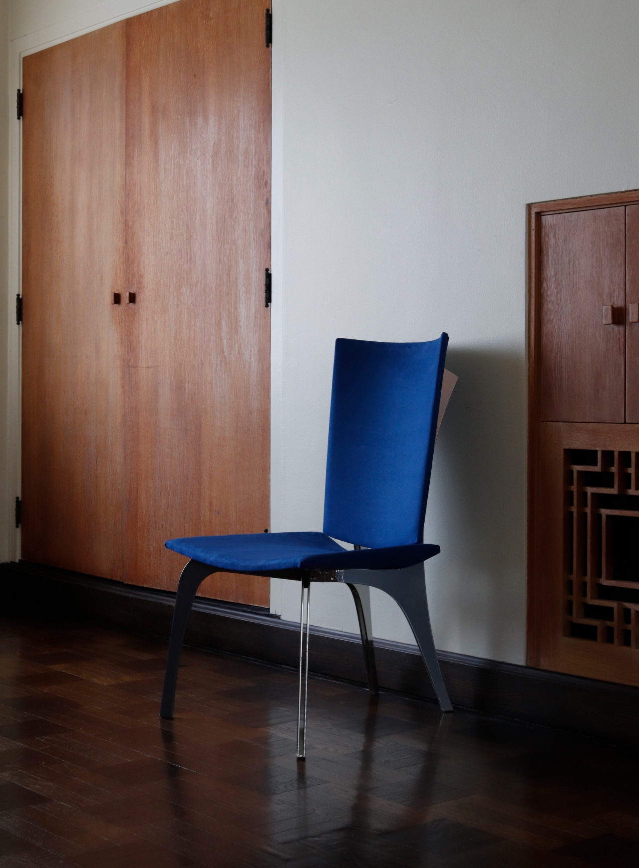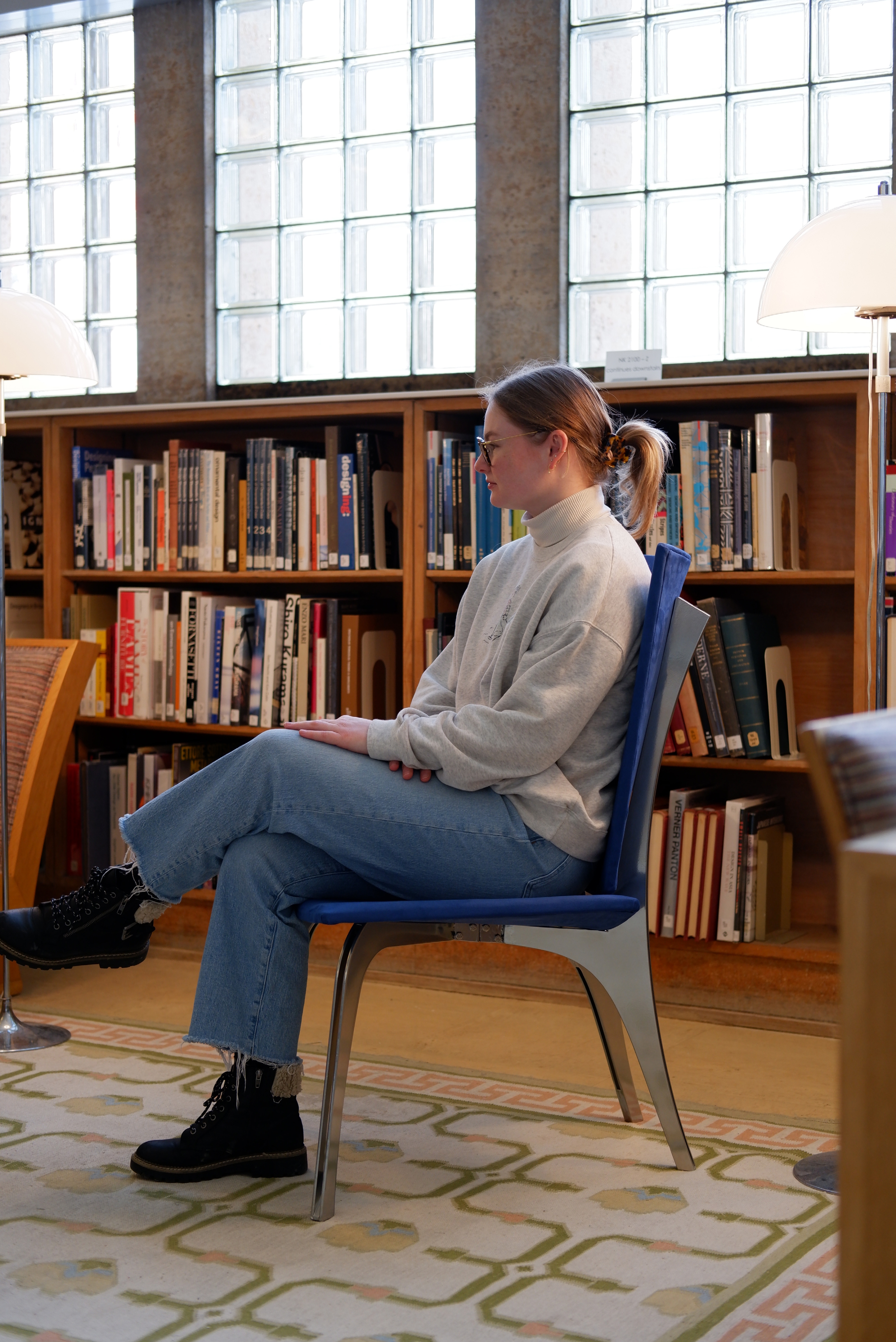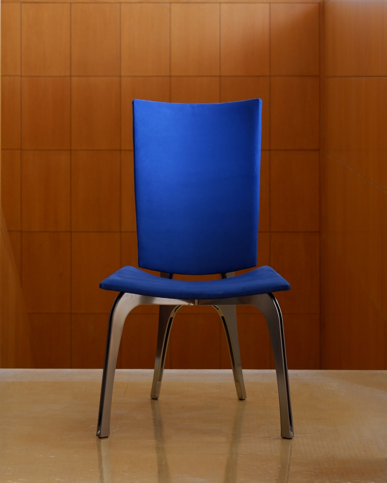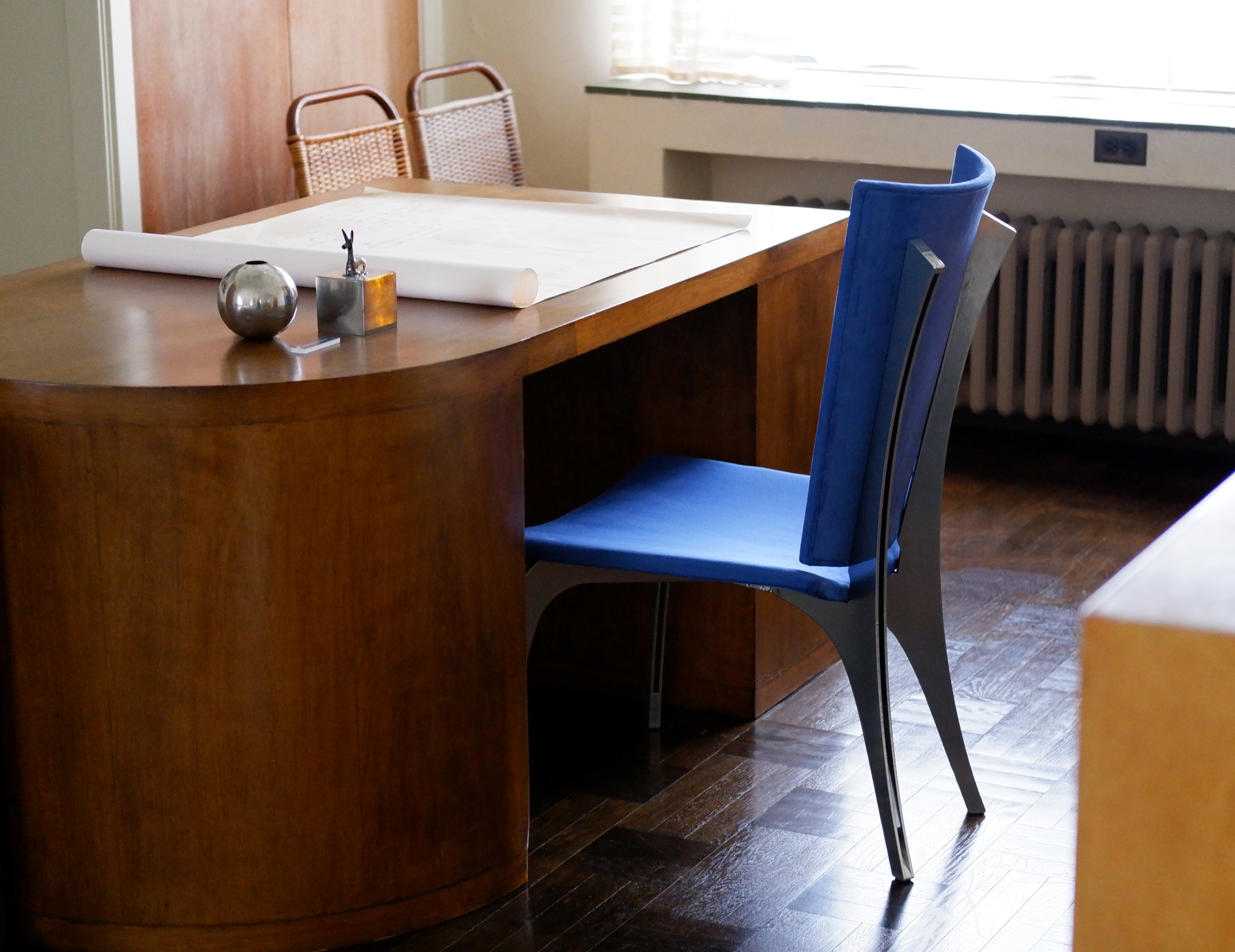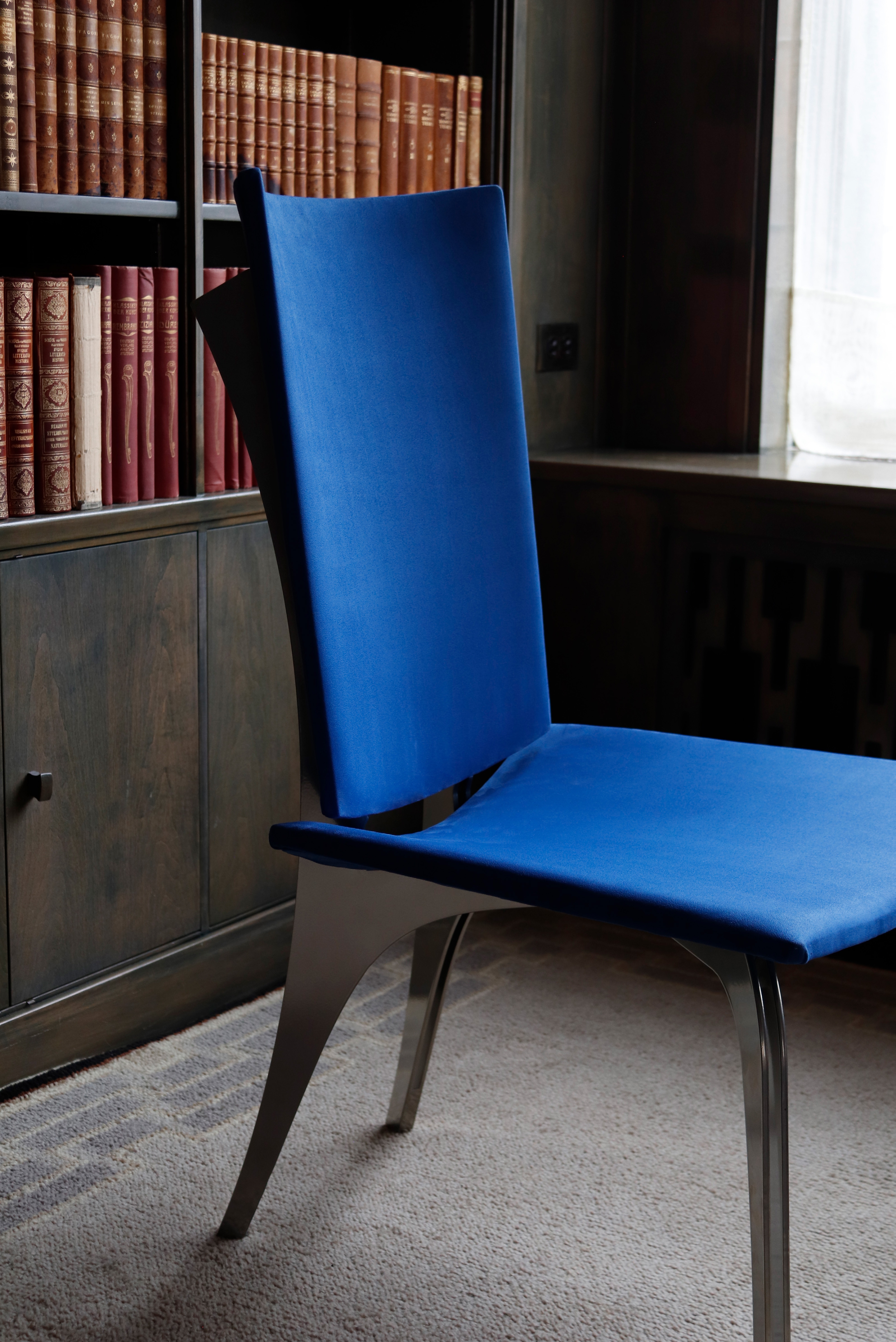 Crafted for longevity and versatility, the chair combines a brass-chrome powder-coated steel frame with 3/8-inch bending plywood, foam, and ultrasuede upholstery. Its robust construction includes furniture-grade screws and nuts to enhance stability, while its clean lines and timeless proportions adapt to various settings. Sustainability is integral, with most components designed for disassembly and recycling, reducing waste and improving transport efficiency. The Thinking Chair transitions seamlessly from public spaces to personal living rooms, offering a lasting, comfortable environment for thought and connection.