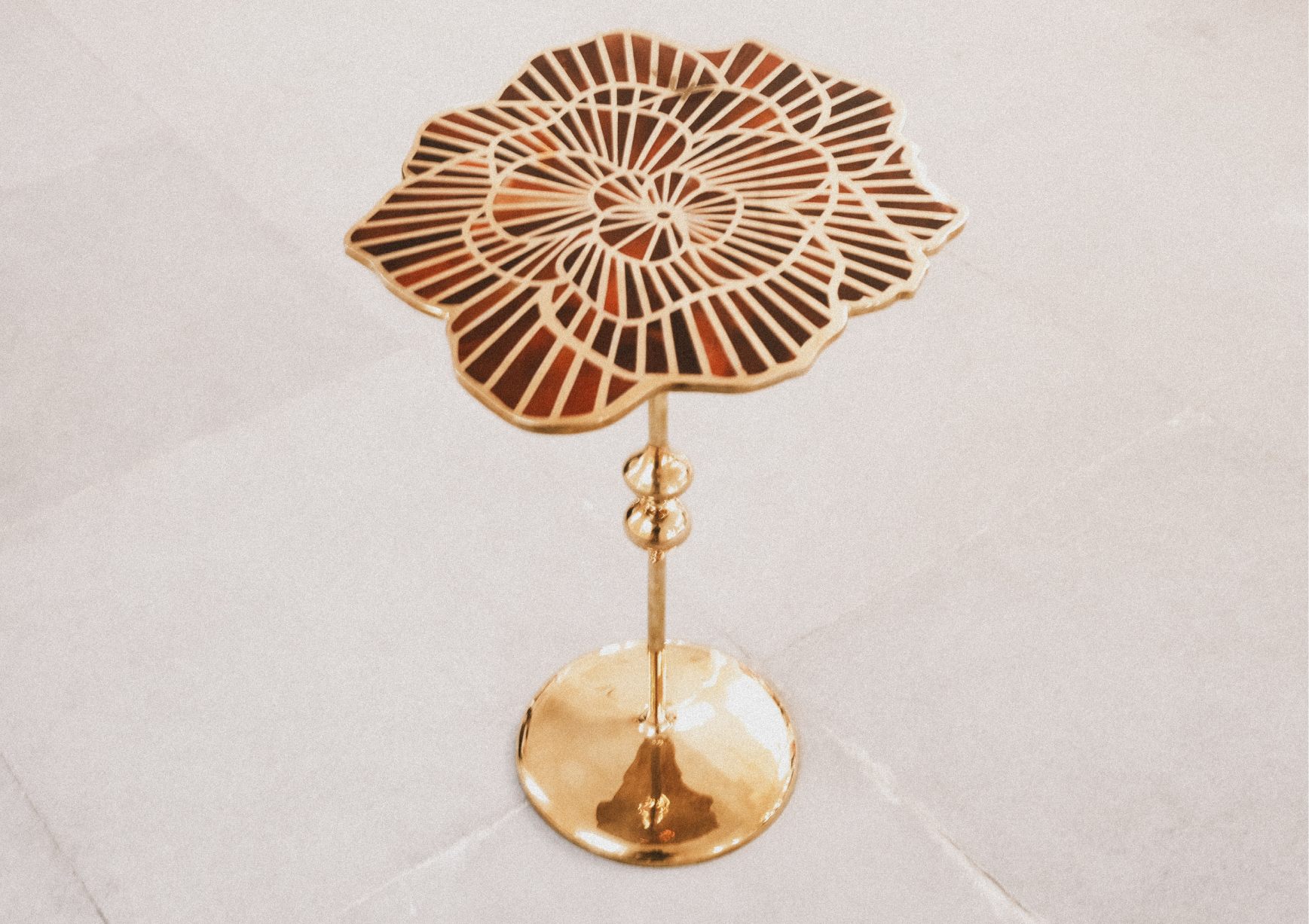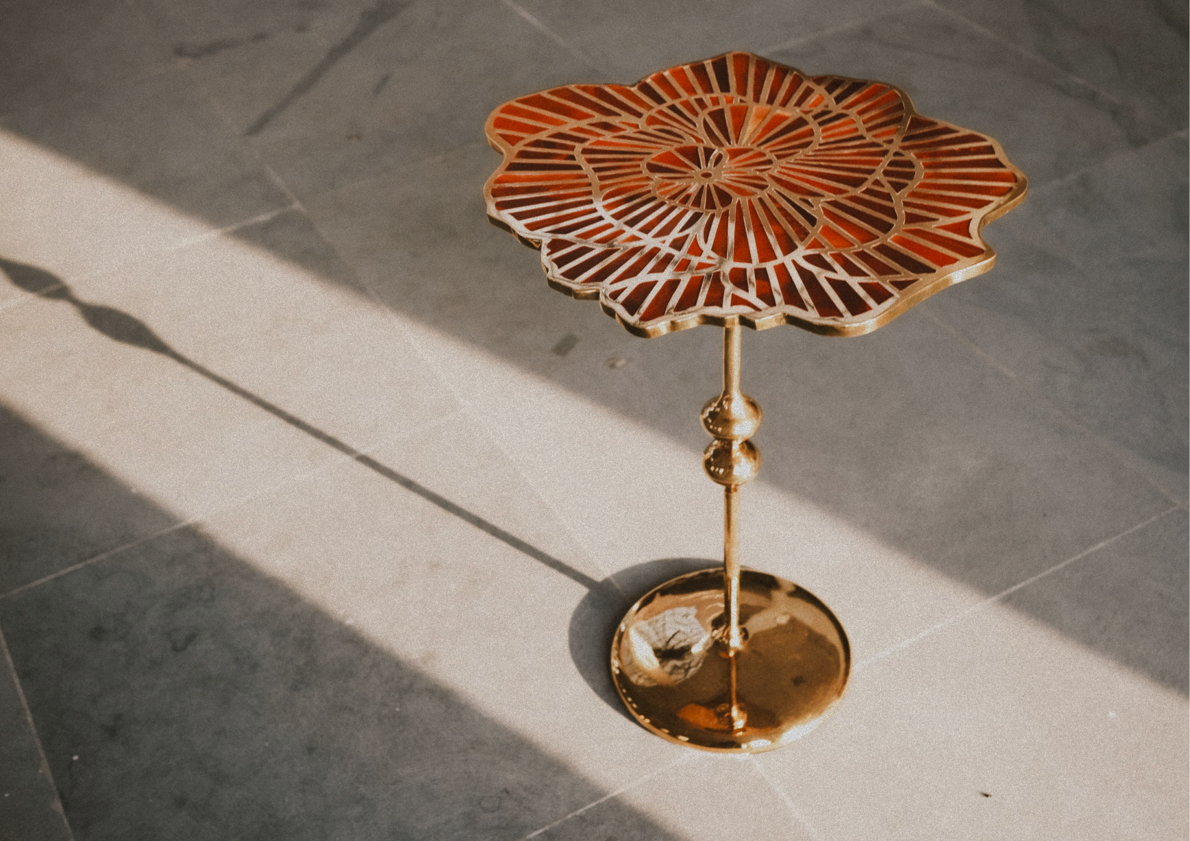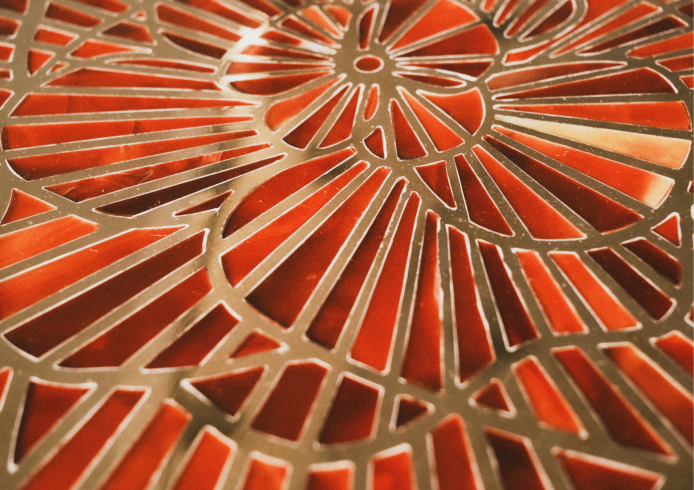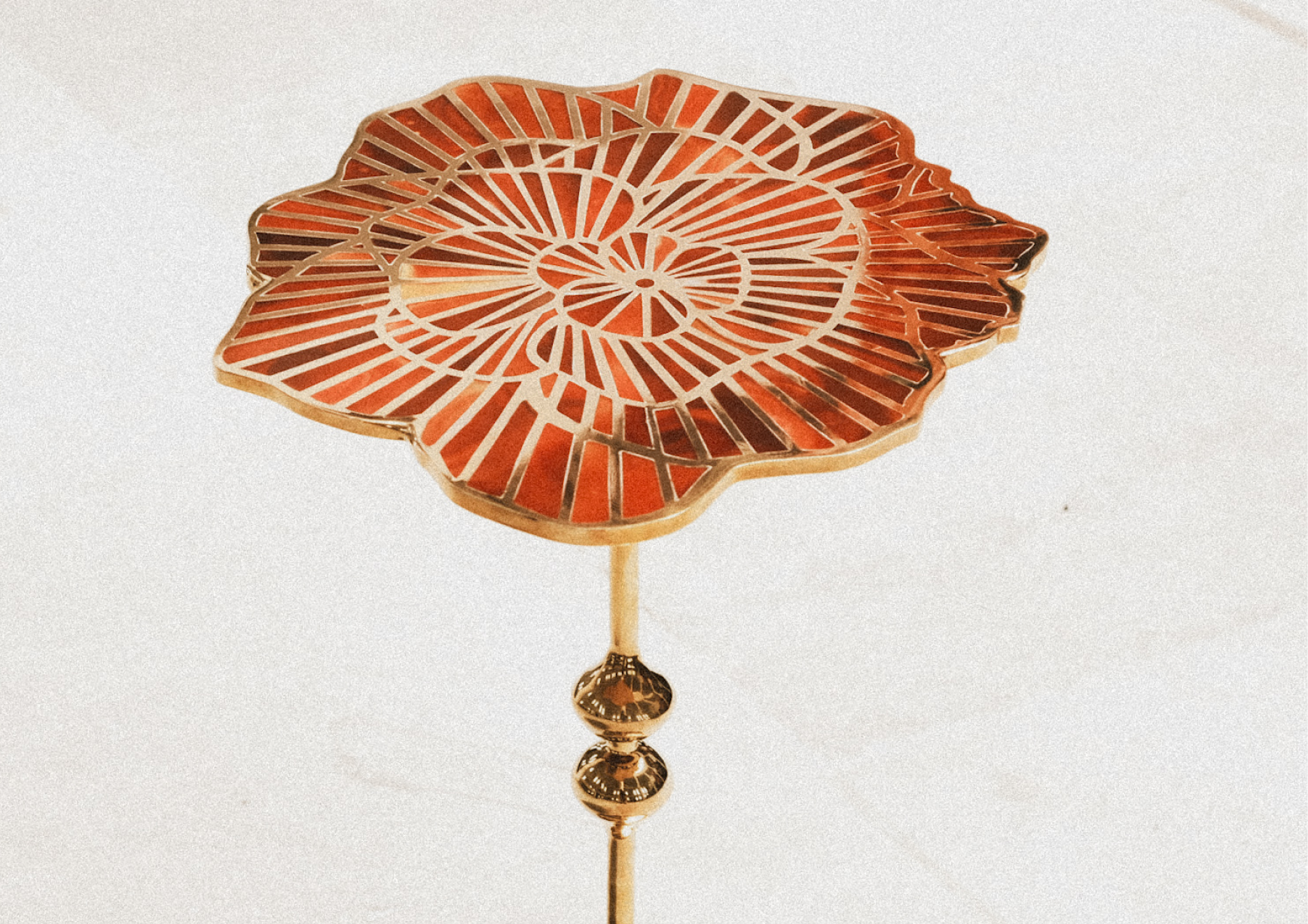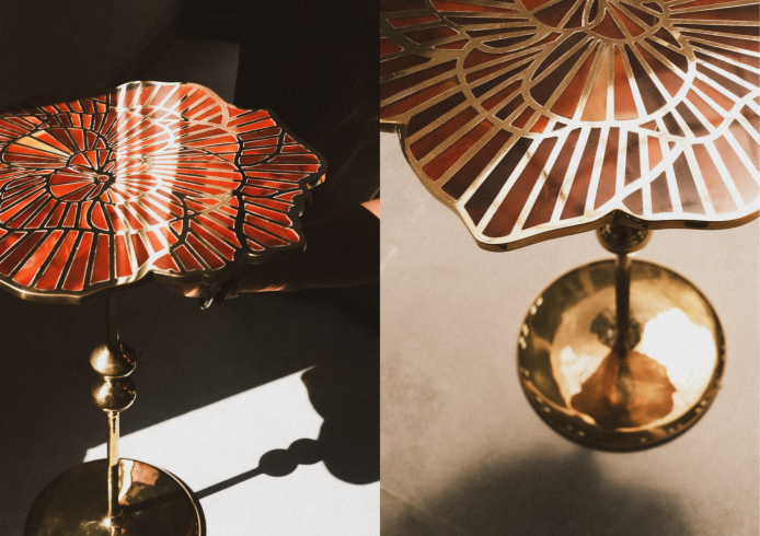 The tabletop features intricate floral motifs inspired by Bombay’s lost greenery, inlaid with semi-precious stones—Red Onyx. These patterns, realized by Moradabad’s master chiselers, blend complementary colors and textures, weaving a serene visual narrative. The stones, meticulously polished, highlight nature’s organic beauty, contrasting with the industrial strength of brass.