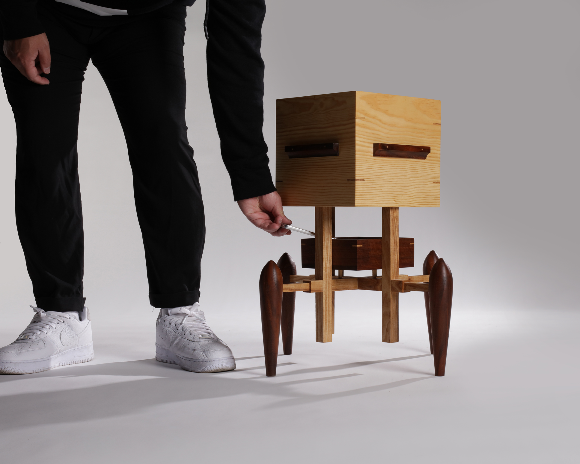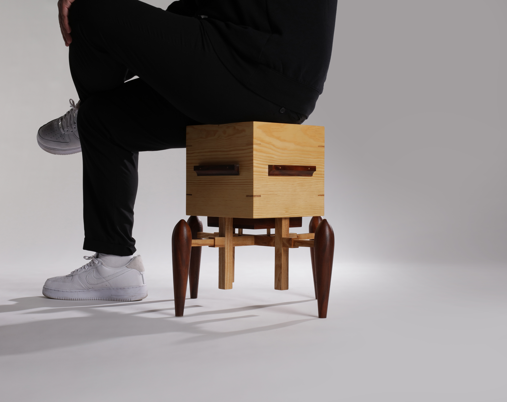 The stool includes a small walnut storage box at the bottom, providing a place to temporarily store phones and other valuables while you enjoy a moment of conversation.
