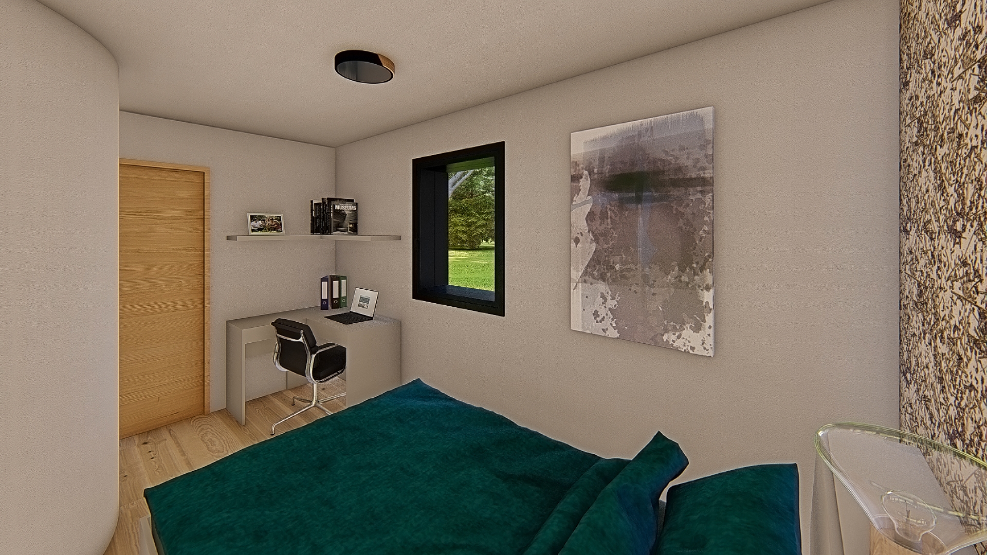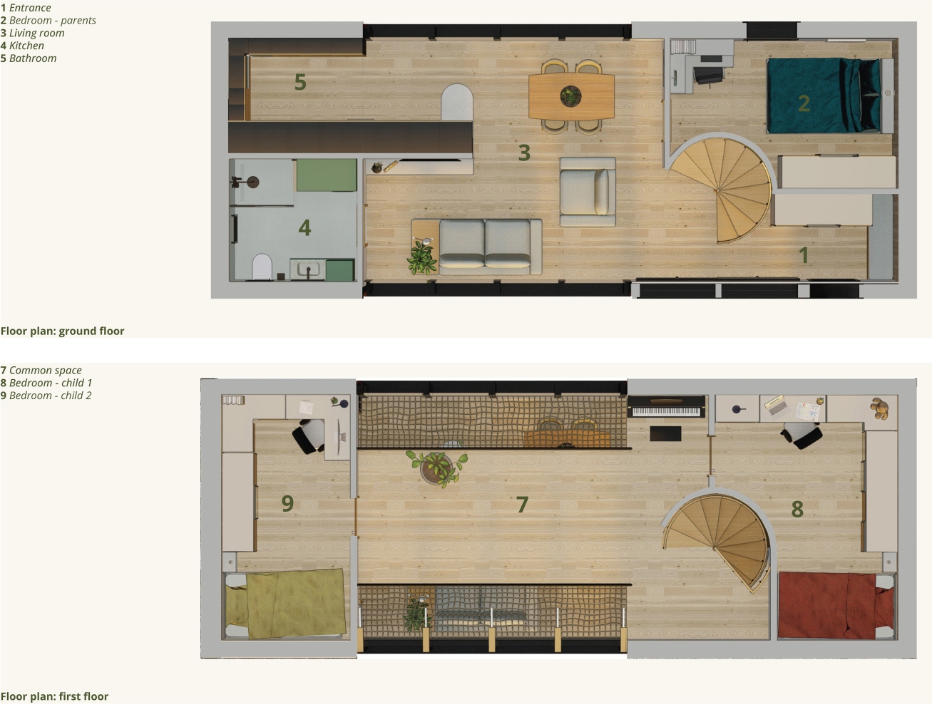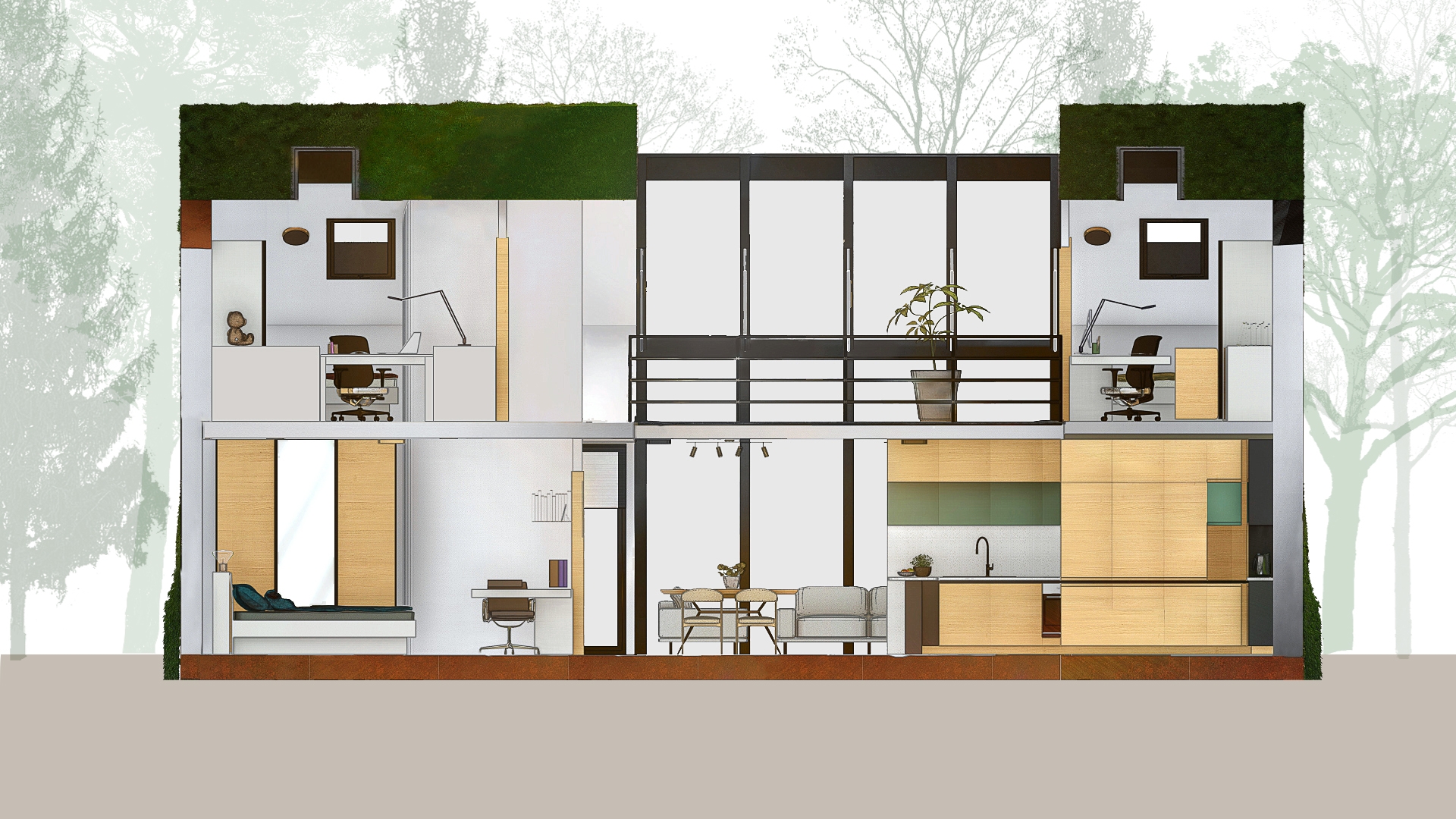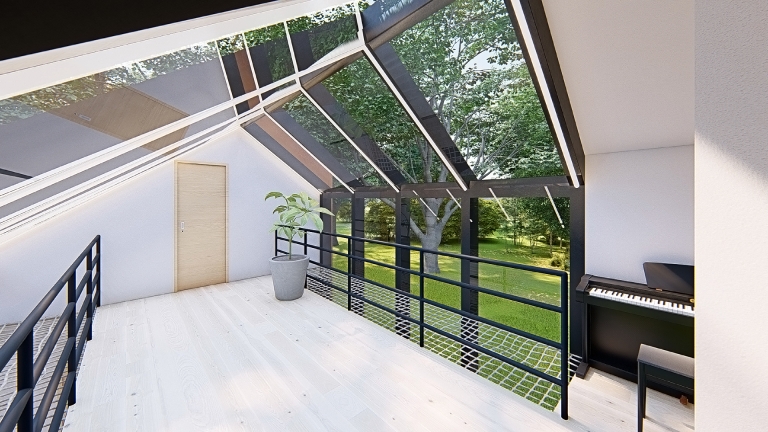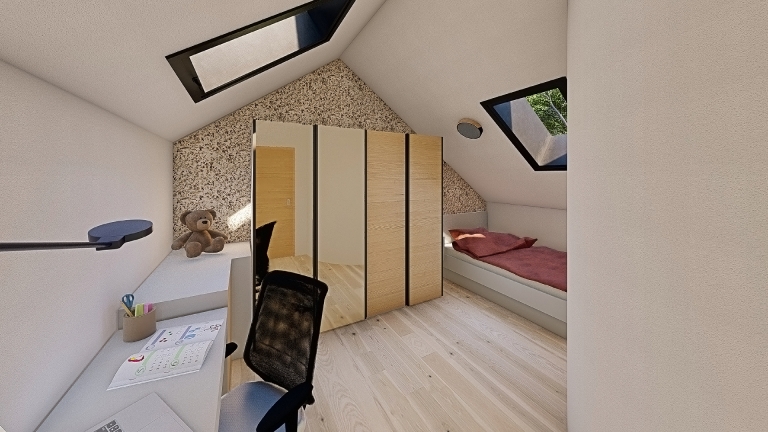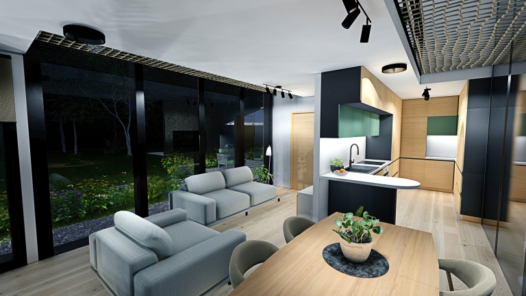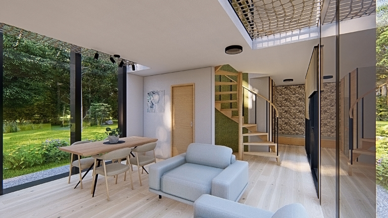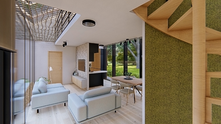 The small house on the Ljubljana Marsh is designed for comfortable living for a family of four, emphasizing sustainability, natural materials, and harmony with the environment. The interior reflects a simple yet functional design, combining light, warm tones with bold green accents as a symbol of connection to nature. Materials such as local wood, corten, and recycled elements create a cozy and eco-conscious ambiance. The spatial layout includes an open living area