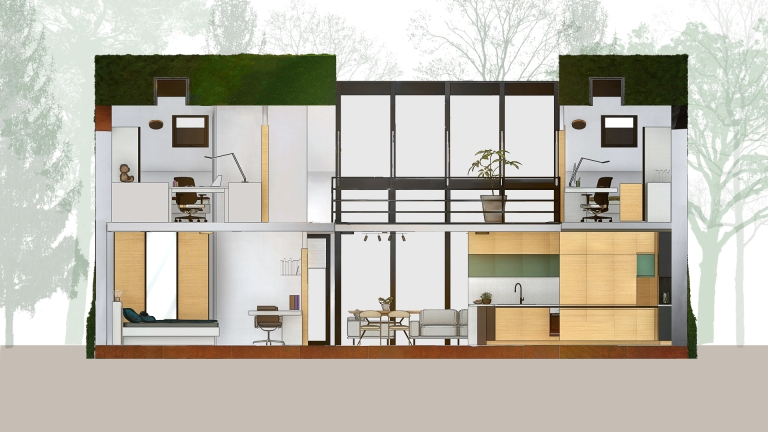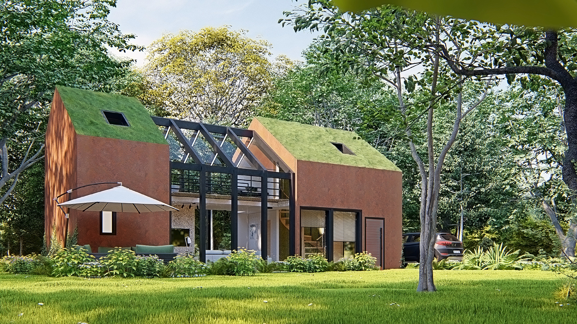 with large glass surfaces that connect the interior to the natural landscape, bedrooms with hidden storage solutions, and a bathroom with natural light and sustainable fixtures. The corten facade and green roof harmonize with the marshland scenery. The house merges functionality, sustainable principles, and natural aesthetics,