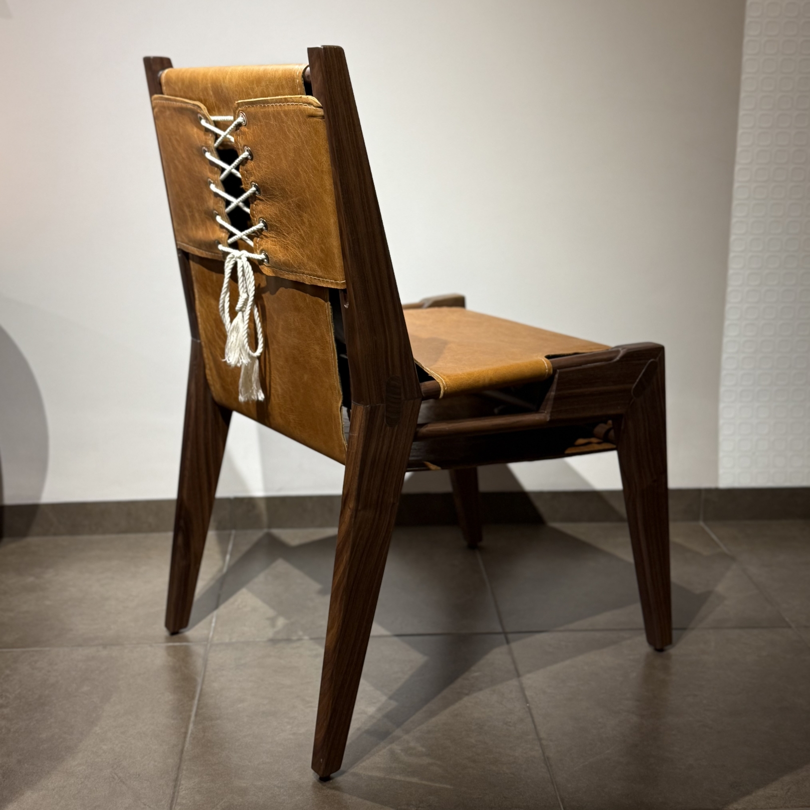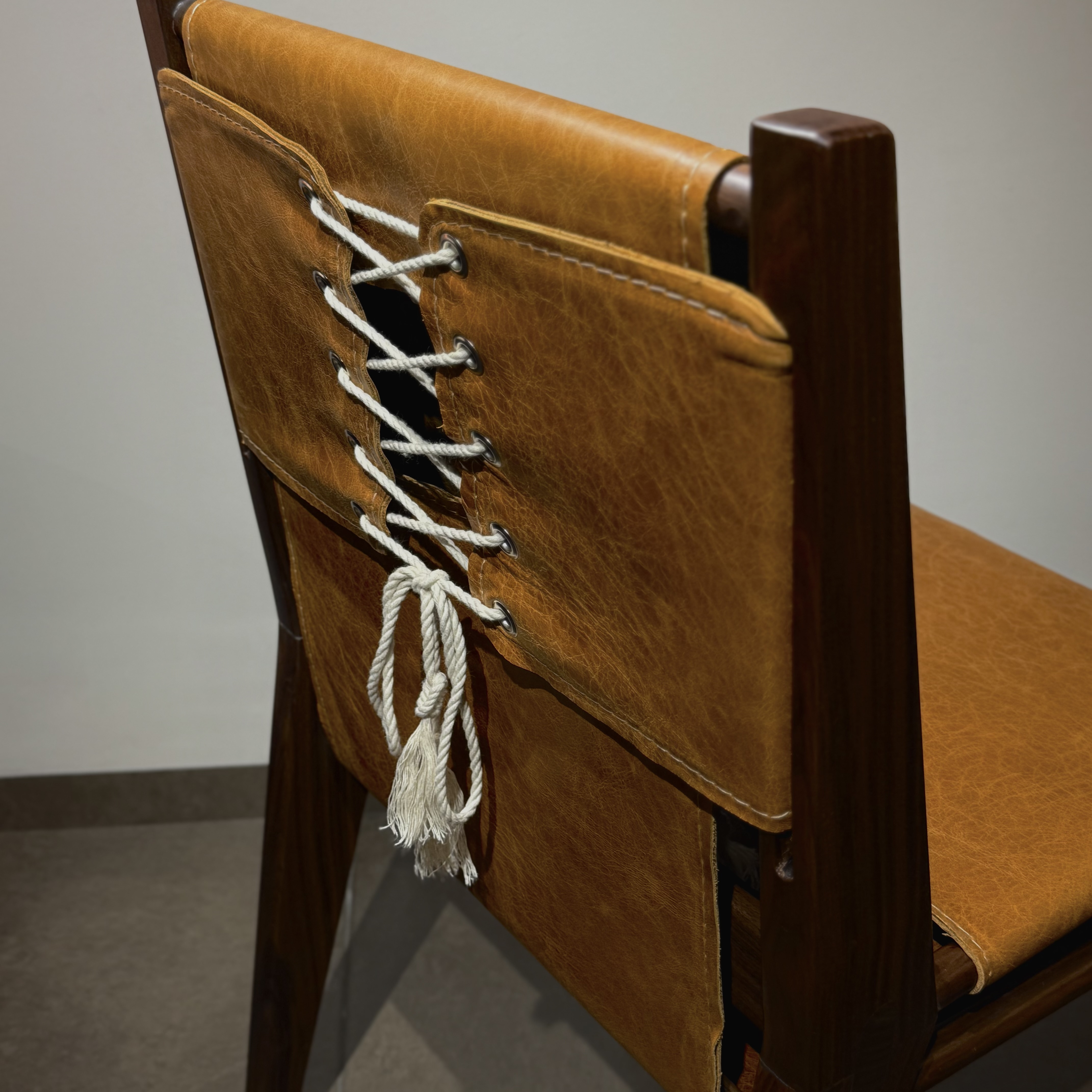 The seat is made of authentic leather, softened and secured using a unique corset-inspired lacing system, where rope threads elegantly through coin-shaped joints. This detail not only enhances the chair’s visual appeal but also adds a subtle contrast—balancing its strong, masculine presence with a refined, gentle touch.