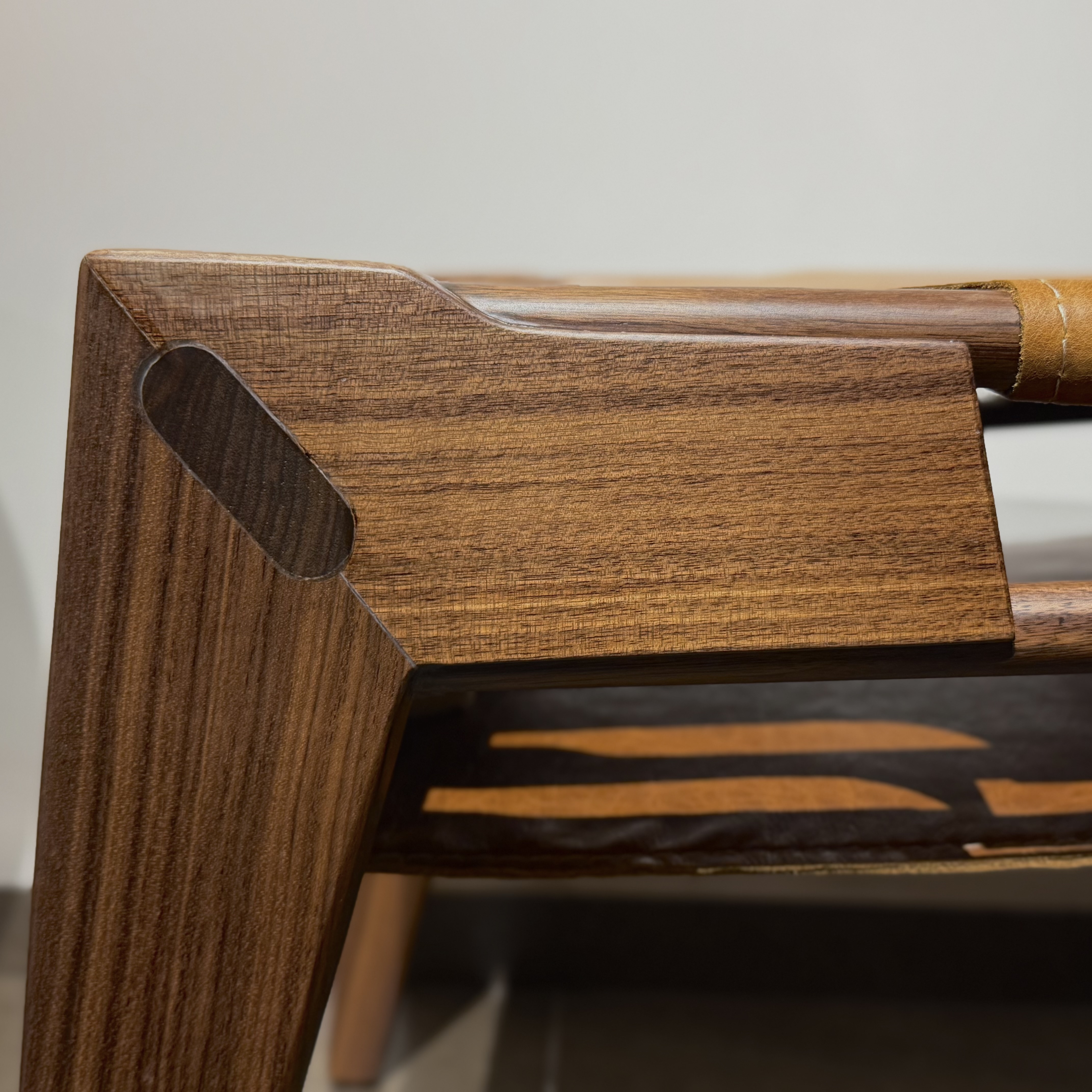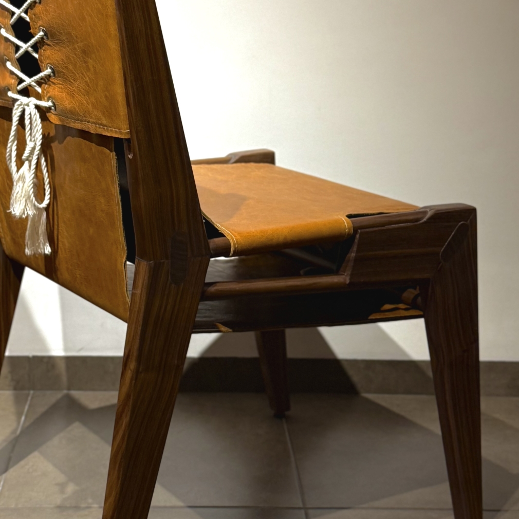 Designed with a contemporary edge, the chair’s frame features sharp yet harmonious cutouts, creating a striking silhouette that modernizes the timeless warmth of wood and leather. The inspiration behind this design stems from the materials themselves—an exploration of how traditional elements can be reimagined for the modern era. The result is a chair that feels both familiar and innovative, a statement piece built to last for generations.