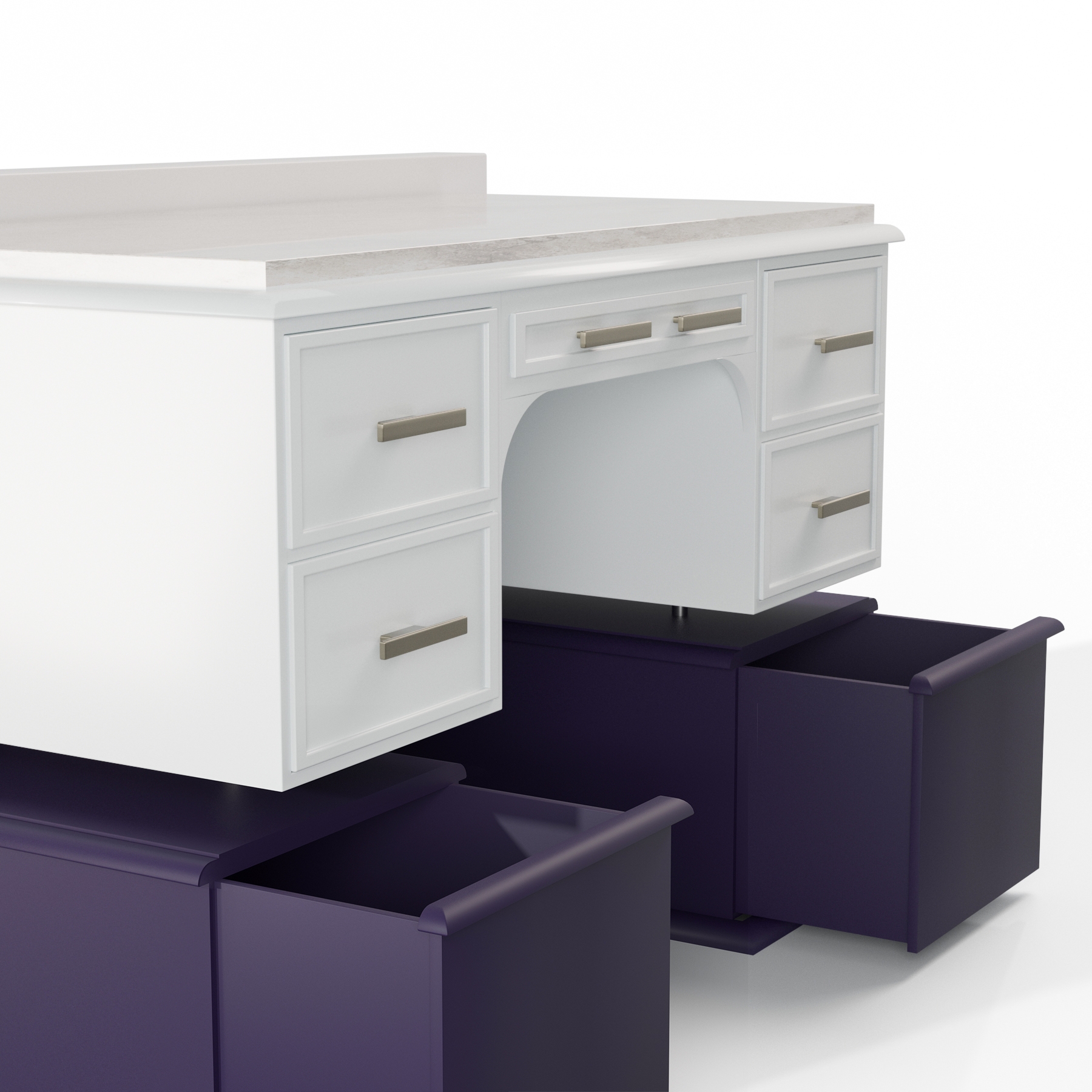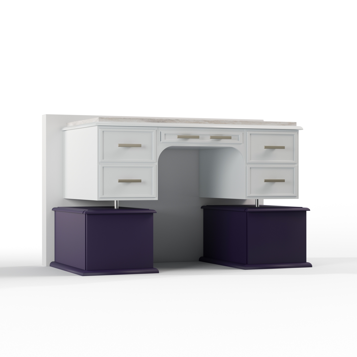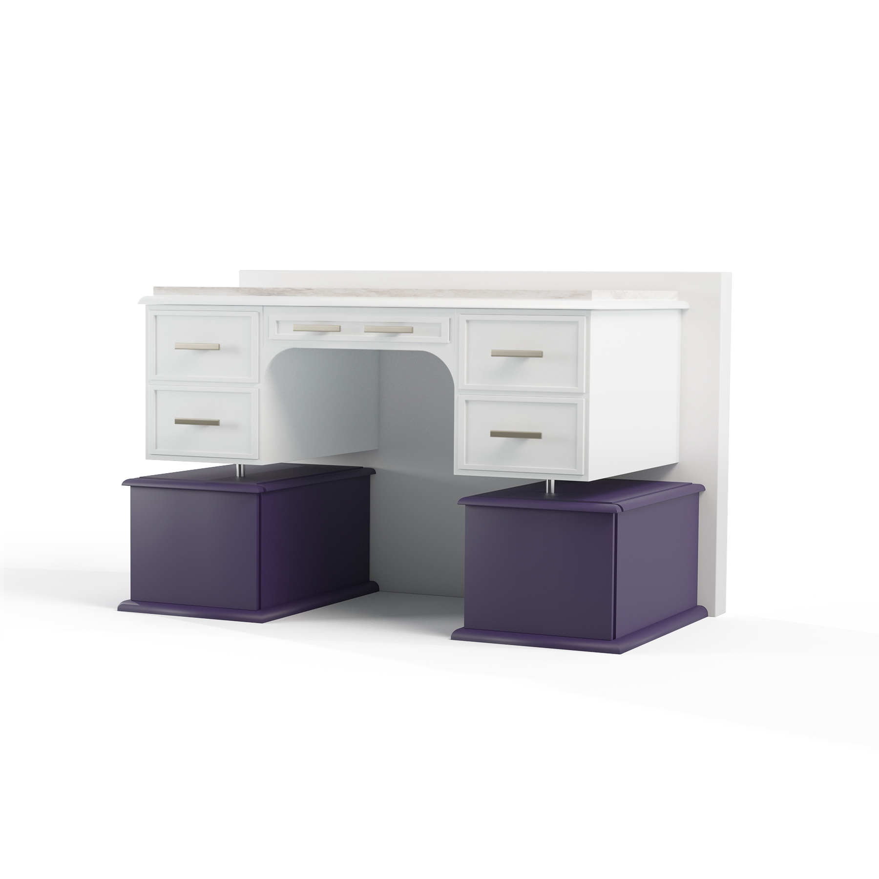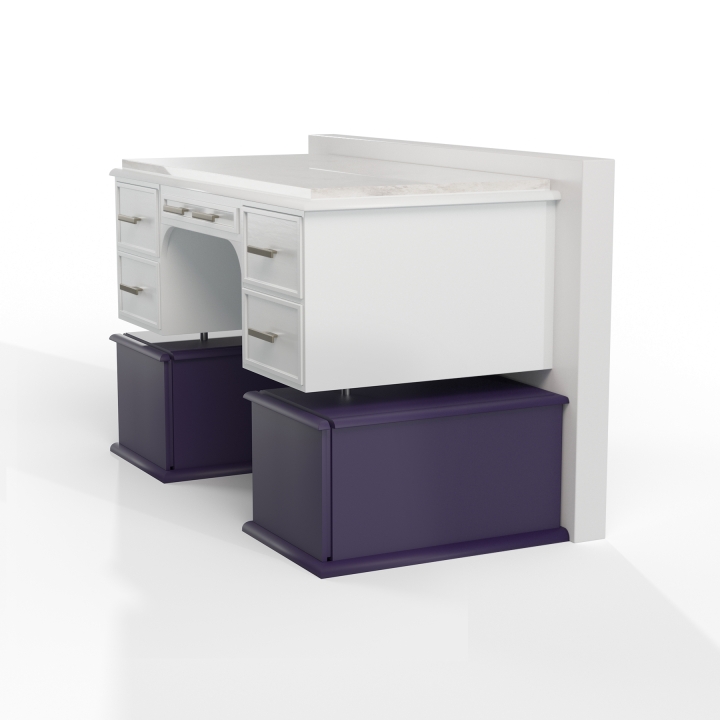 This design transforms an antique desk into a modern, futuristic vanity, embodying a regenerative approach that values heritage while embracing contemporary aesthetics. The project began with digitalizing the existing furniture to develop a solution that integrates seamlessly into the client’s modern space. Inspired by the fusion of past and future, as seen in Gattaca, the design maintains the essence of the original piece while reinterpreting it with a minimalist and refined composition. The ornate legs were removed to introduce a floating effect, achieved through a high-back panel that frames the piece like a museum exhibit. Two travel trunk-inspired drawers were added to honor the client’s passion for vintage luggage. High-quality finishes, including a white lacquered structure, stainless steel handles, and a marble top, elevate the design’s elegance. This project overcomes traditional constraints of furniture reuse by blending digital modeling, craftsmanship, and a forward-thinking aesthetic.