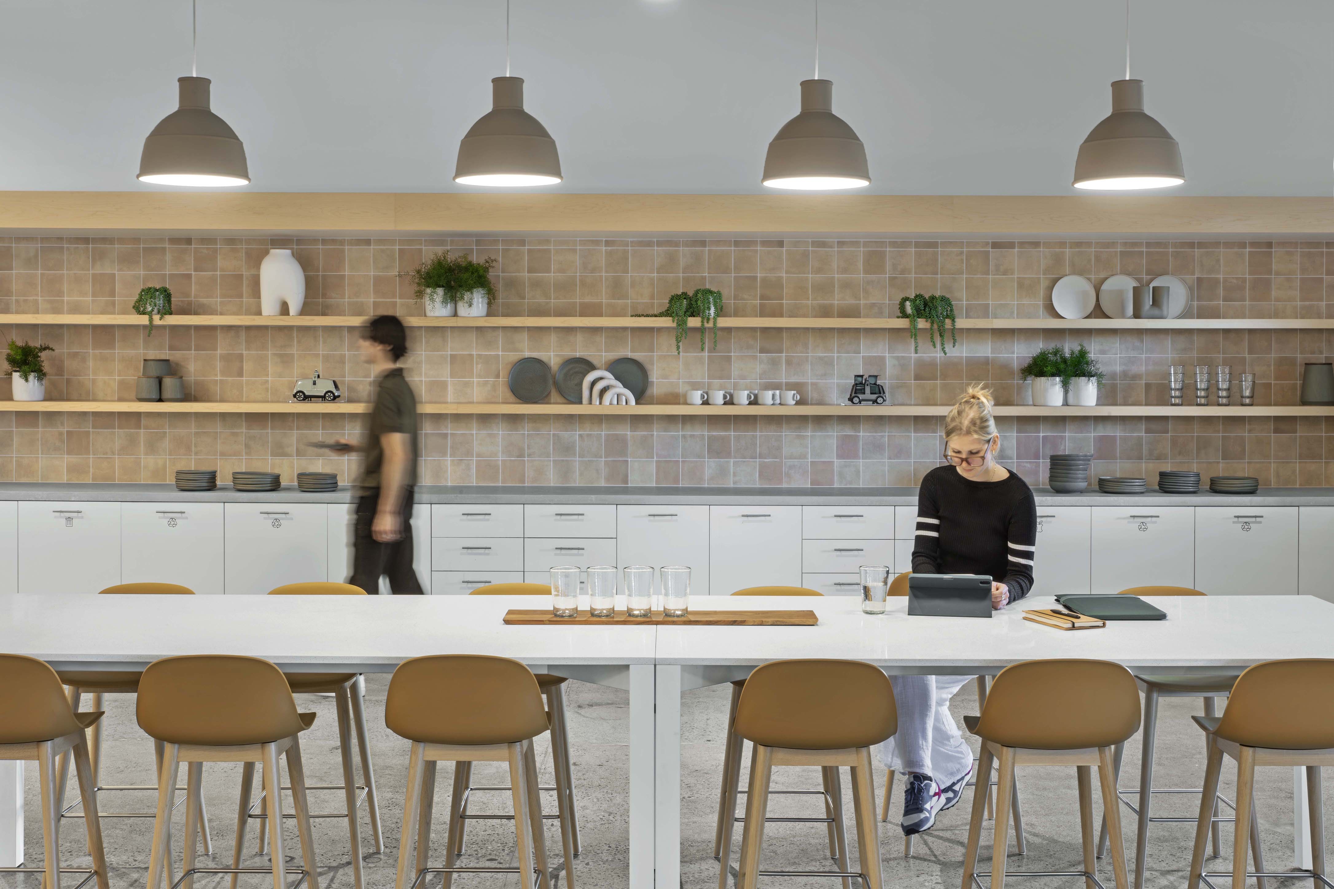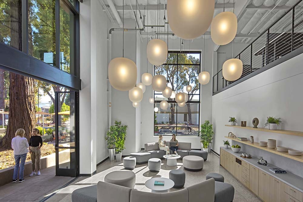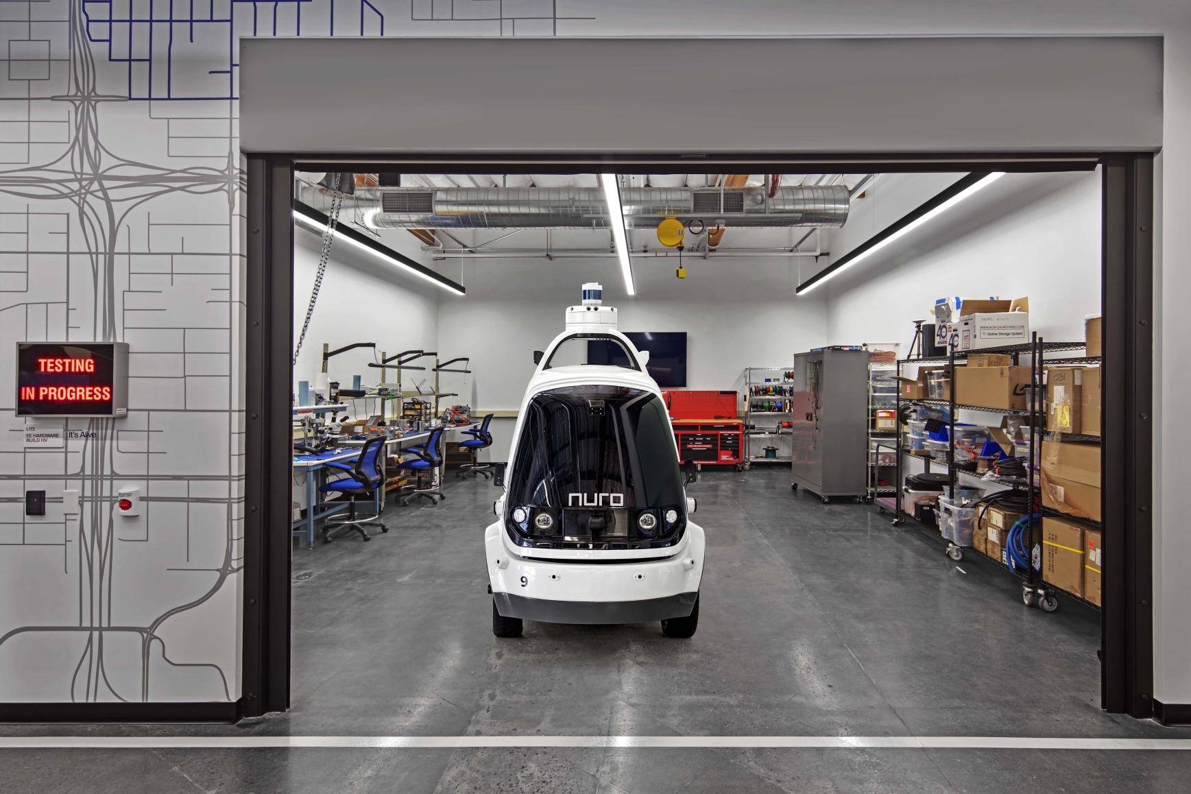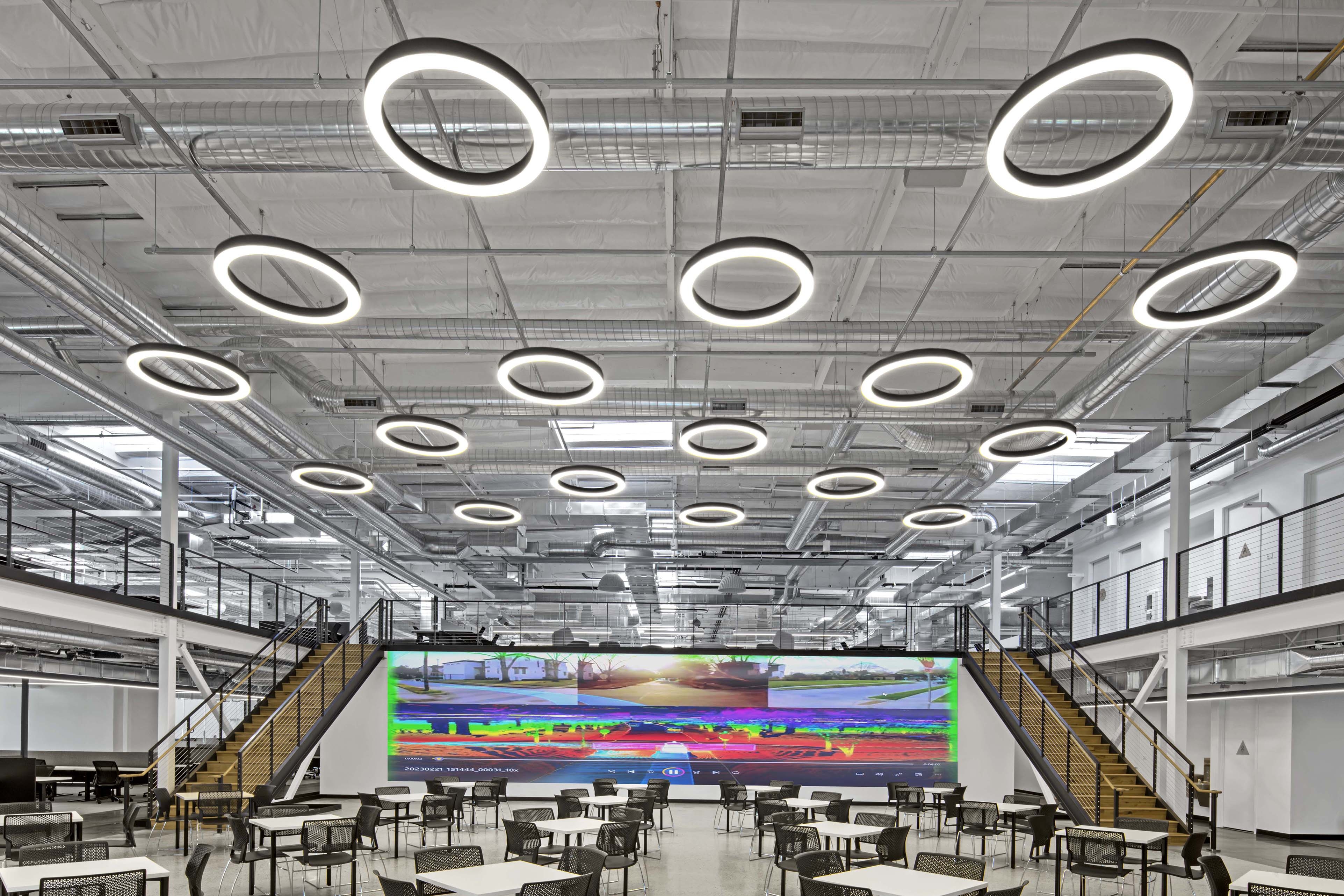 The architects transformed two warehouses into one modern, connected R&D environment that elevates the brand of autonomous vehicle maker Nuro and distinguishes it among its peers. Inspired by Nuro’s vehicles, the workplace layout utilizes classic urban design principles. The striped ring “road” connects all spaces and separates the inner loop—the dense “urban center” with support spaces, meeting rooms, labs, and the building core—from the outer loop, which is open and expansive, with airy workstations areas and roadside kitchens for casual socializing, recharging, and connecting.