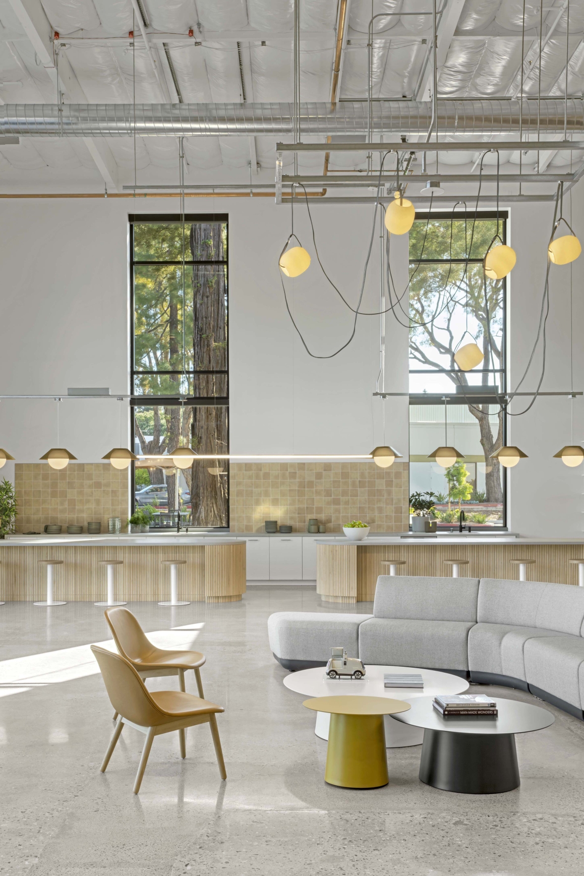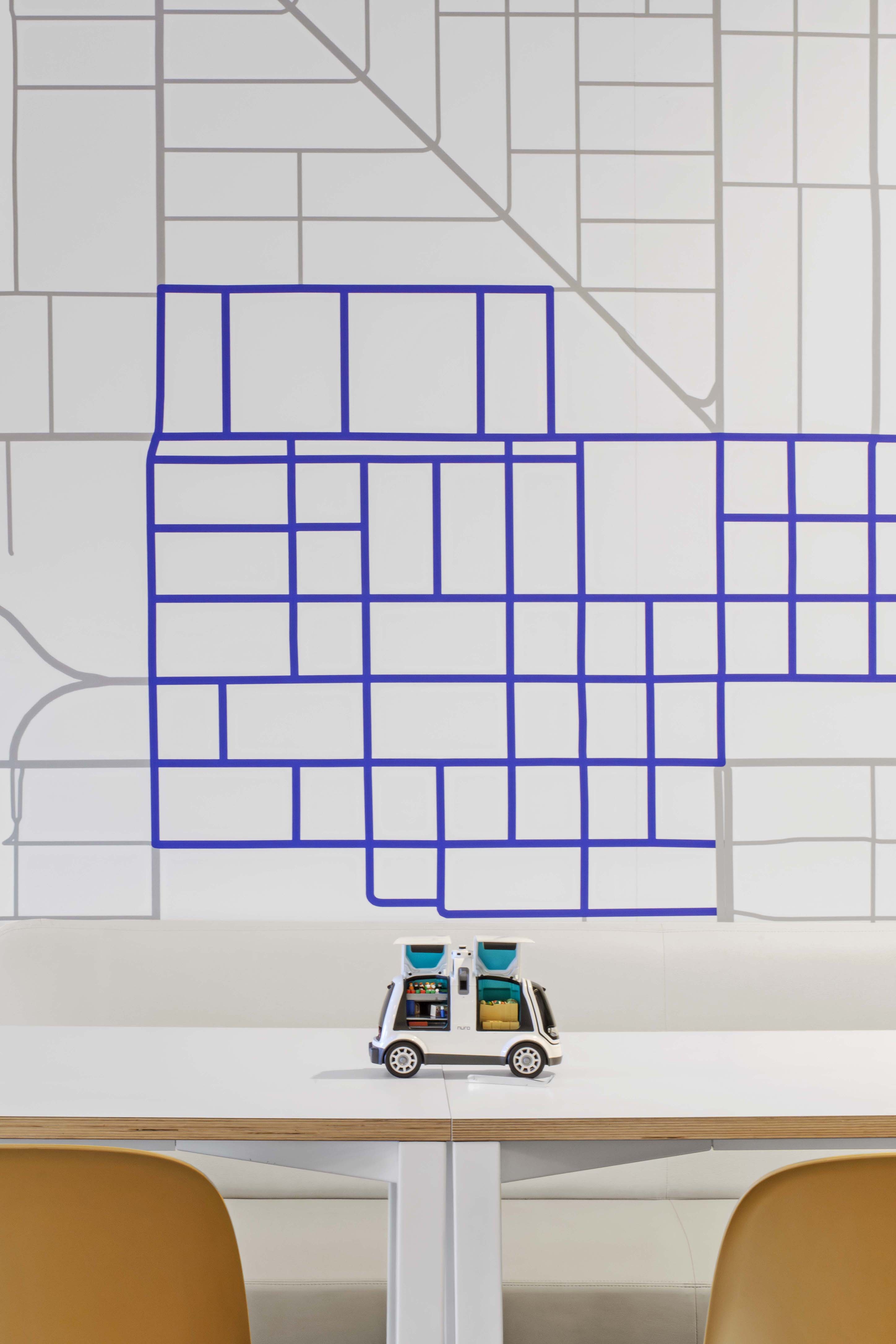 Sharing Nuro’s conviction that a sustainable project is the one already built, the architect creatively reused the existing buildings and minimized the use of new finishes, resulting in the project’s low embodied-carbon impact. Minimally processed materials such as wood, concrete, and woven fibers are incorporated in a natural color palette. Research spaces sit next to collaboration rooms, where acoustic panels soften sound; the cafeteria features multiple seating options; and miniature vehicles, graphic installations, and video monitors immerse teams and visitors in the brand story.
