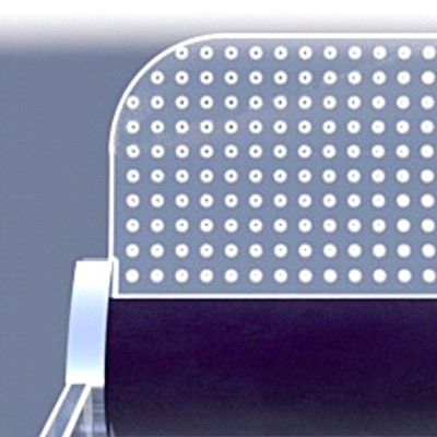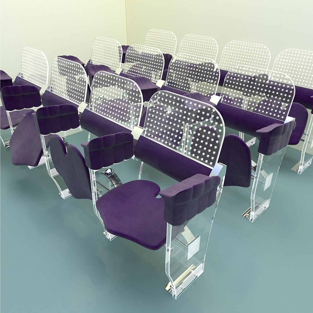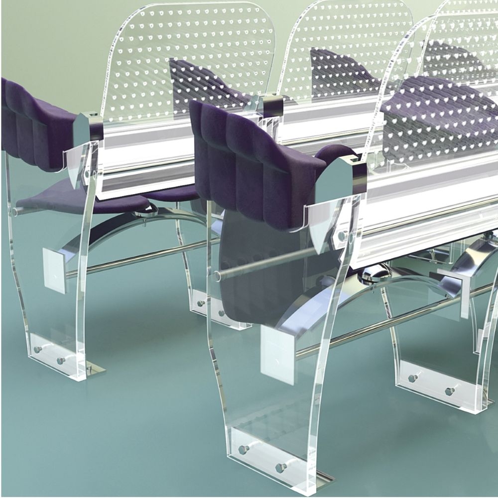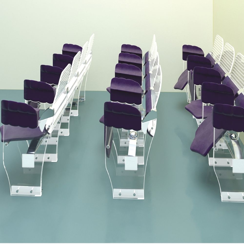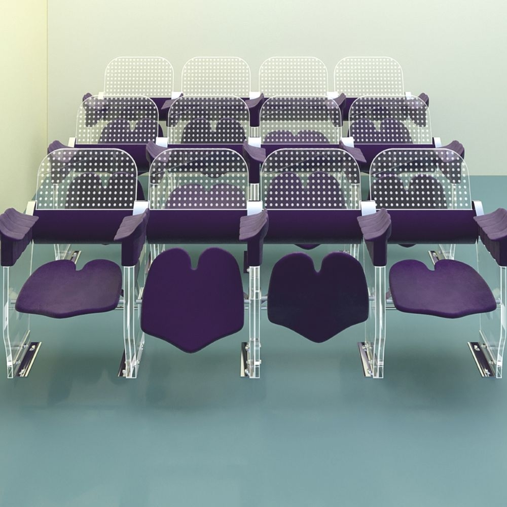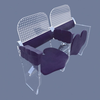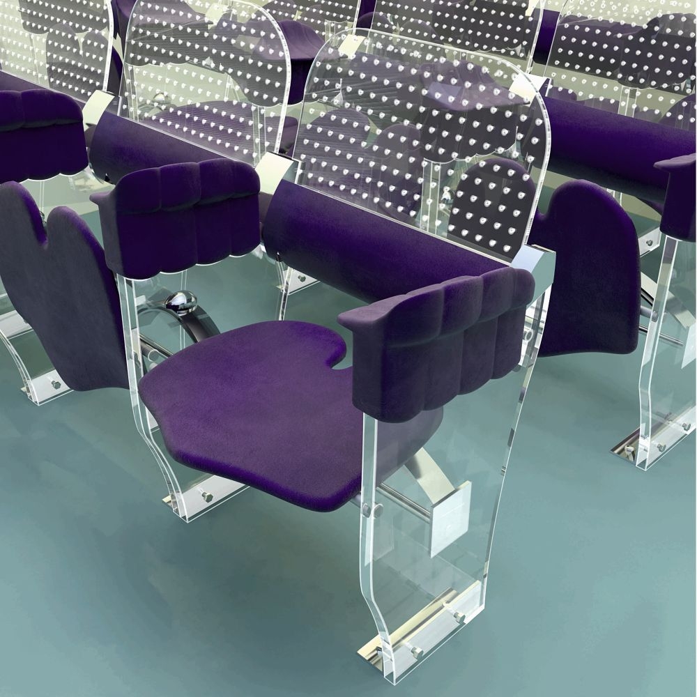 The used materials are transparent plexiglas- lasercut, with a smooth ambiente illumination and durable high quality fabric for the seat, armrest and lumbar backrest. Both can be replaced by durable, comfortable options like high tech polymer, carbon, ntp etc. The coushoned rigid cantilever seat is 50/45 cm, at 45 cm height. It`s profile is concave under the legs to improve the bloodcirculation and convex in the middle to prevent sliding forward. A slot in the middle of the rear part is protecting the coccyx. The seat can be occupied by turning it backwards, not forward- a patented feature allowing it`s oscillation under the bodyweight while seating. Multiple adjustable leaf springs underneaths are providig the smooth feedering. The backrest and the armrest supporting the upperbody create a decompression in the lumbar spine thanks the backrest - inclinated backwards and following the backbone curves. The armrest is adjustable in the height, with one concave surface directed to the seat, next one to the neighbour. The side view is reminding a fist rising from the ground, a symbol of togetherness and solidarity to inspire the audience.