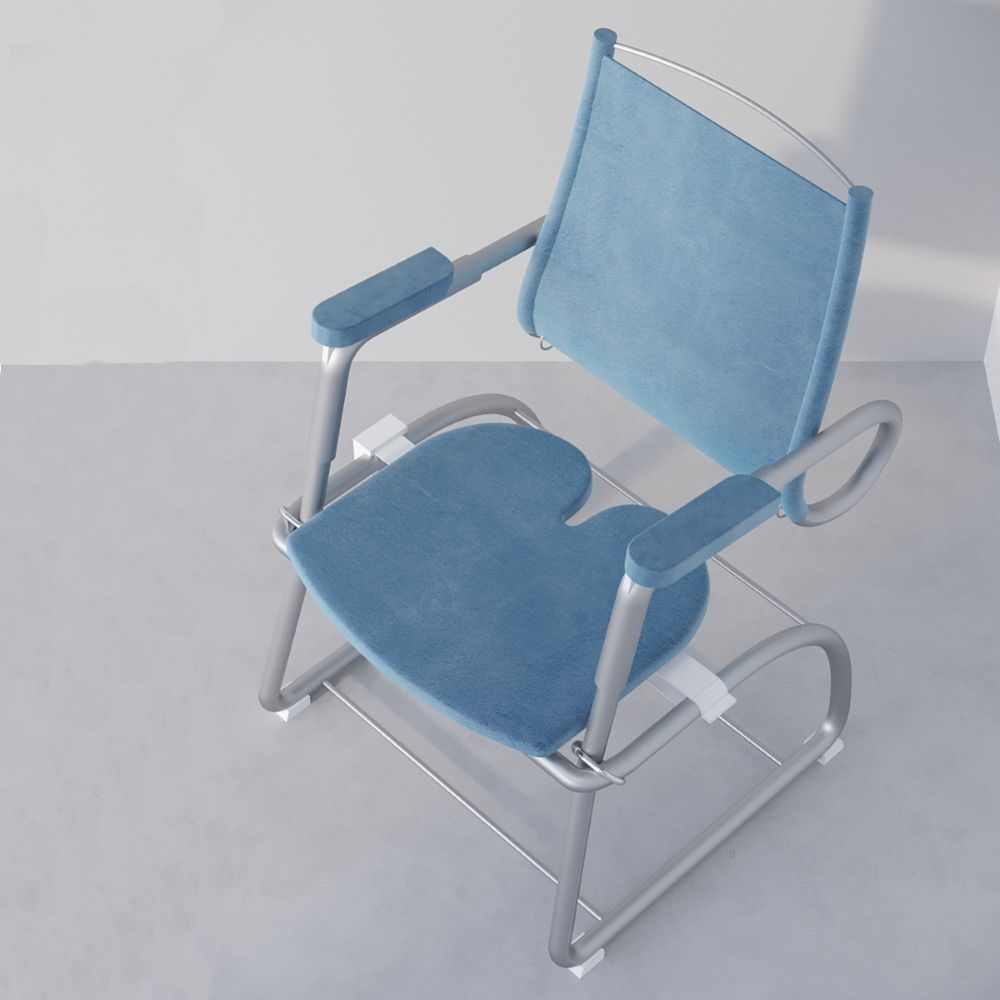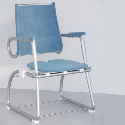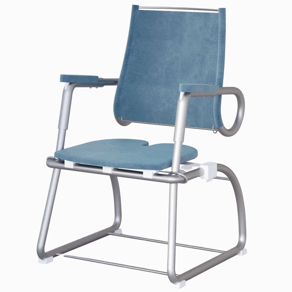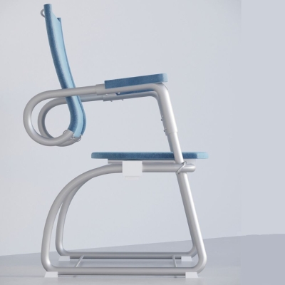 „Comma1" is a chair with coushoned rigid cantilever seat (50x45 cm at 45cm height) attached to the front legs only. A slot in the middle of the rear part is protecting the coccyx. The profile of the backrest is accordig to Dr. Akelbrom, inclinated backwards,following the curves of the backbone – concave with 140 cm radius in the upper part and convex with 13 cm radius below. The frame is trapezial for more stability. The material of the back is durable fabric (like the surface of the seat and armrests), spanned between the pipes of the frame placed in it‘s sleaves. It can also be a mesh, or leather.