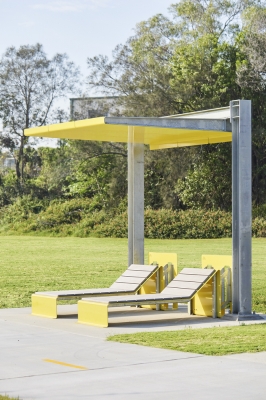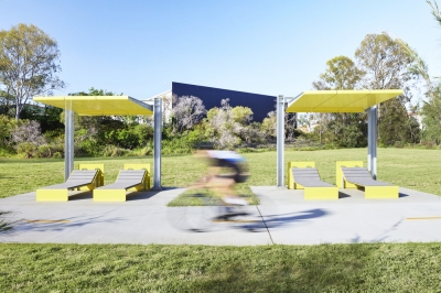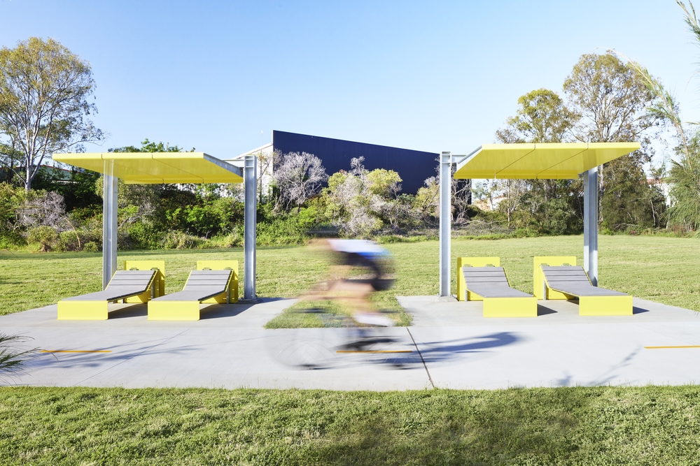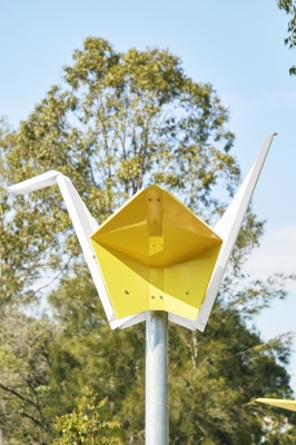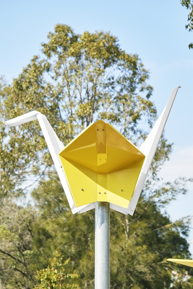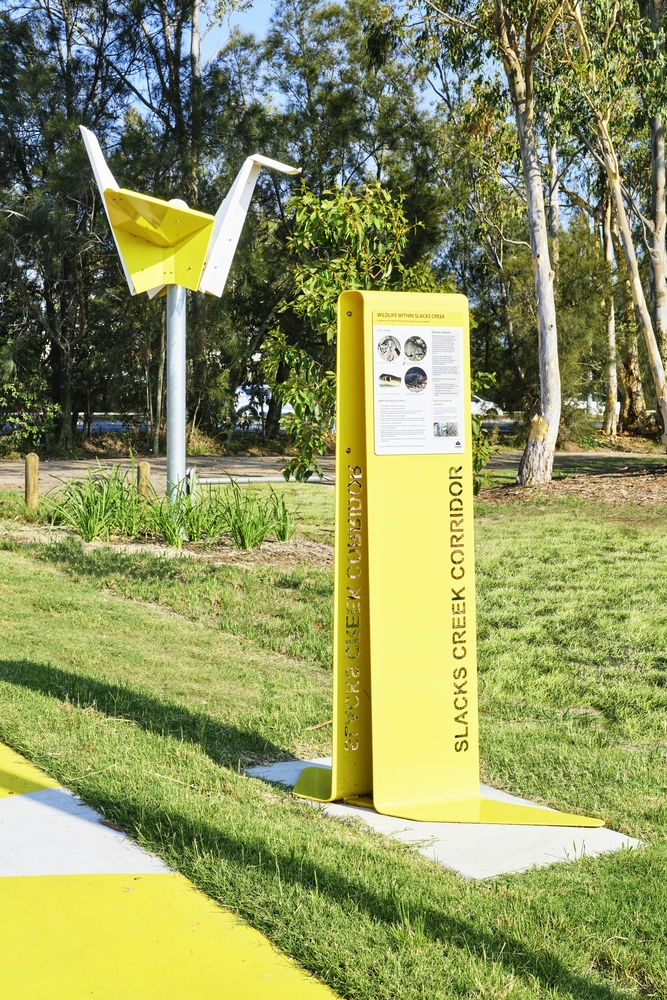 The general design principle for the project provides lightweight feature forms that have in direct reference to the nature of the site. The design includes some components that feature the steel flowing like water across the concrete modules and folded origami paper shapes perched on posts. The objects are intentionally installed at varying levels to depict the different flood levels experienced overtime throughout the Slacks Creek catchment.