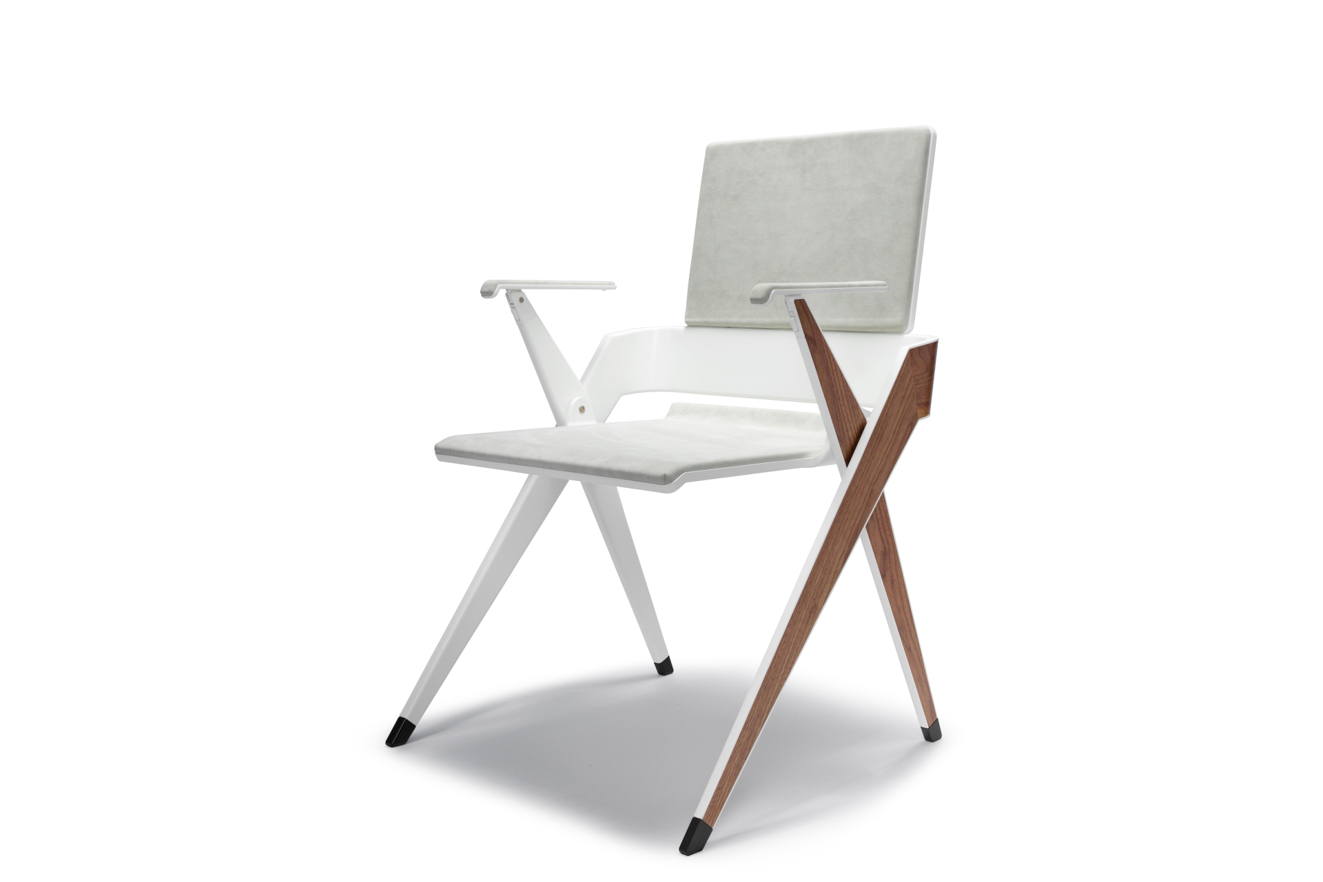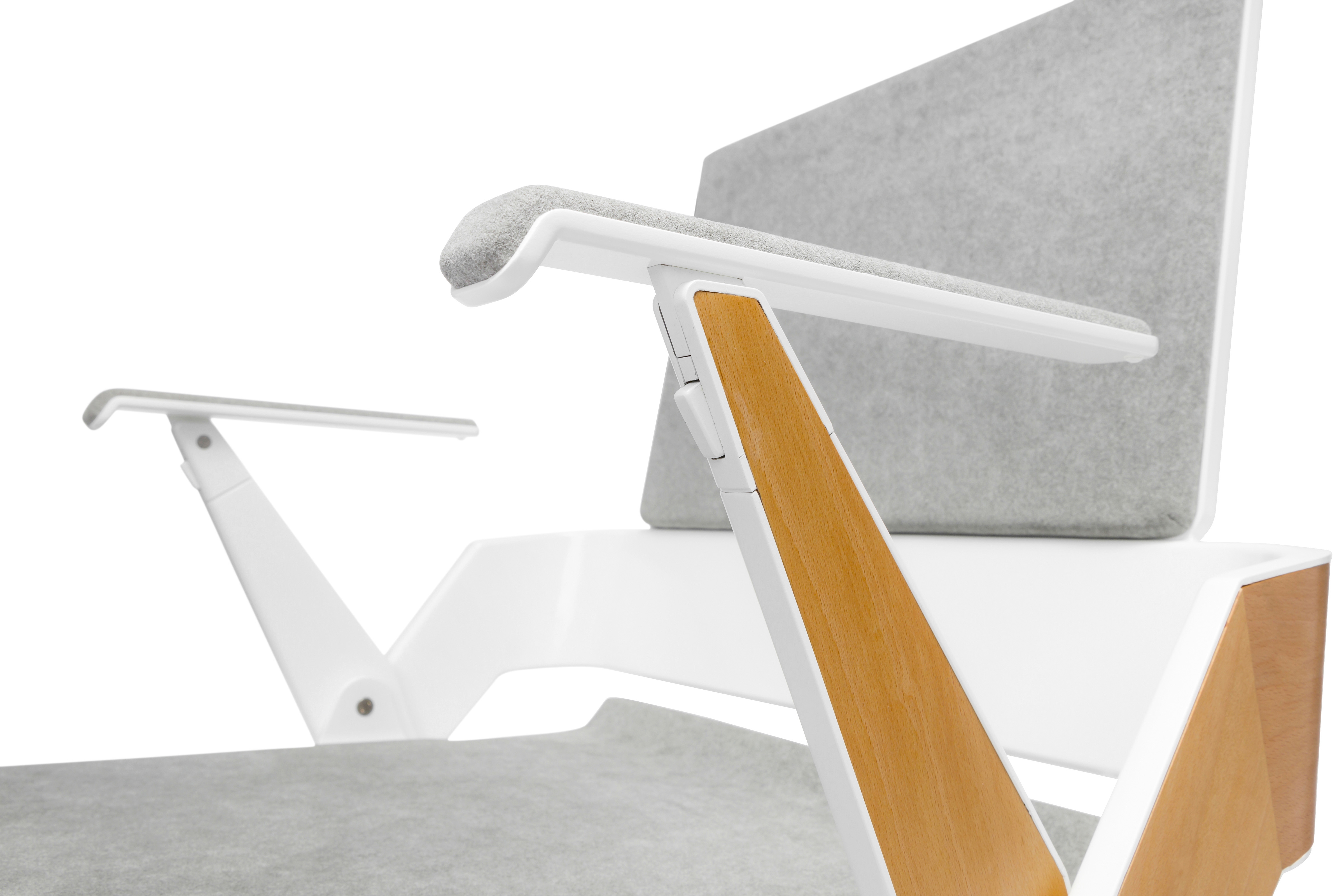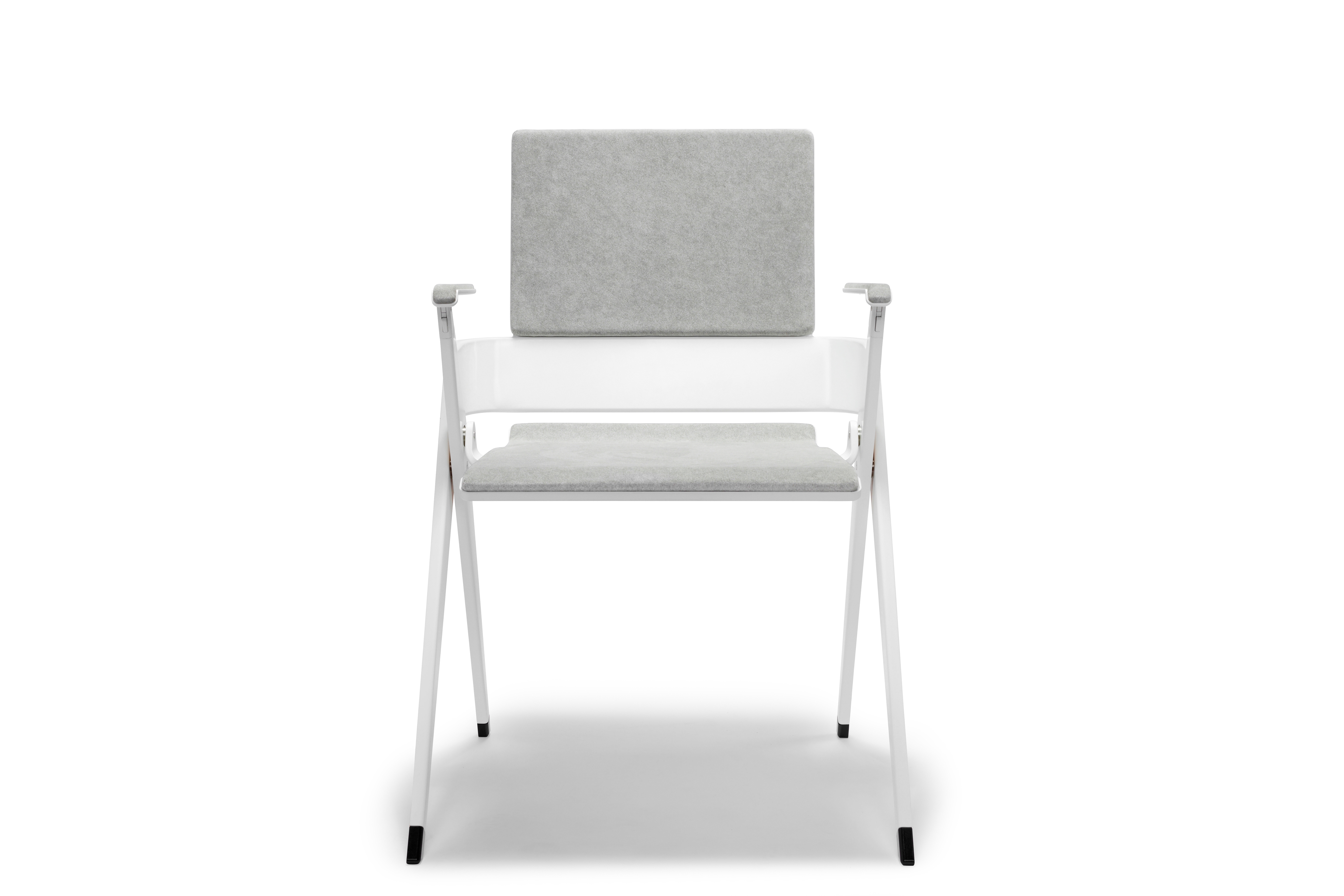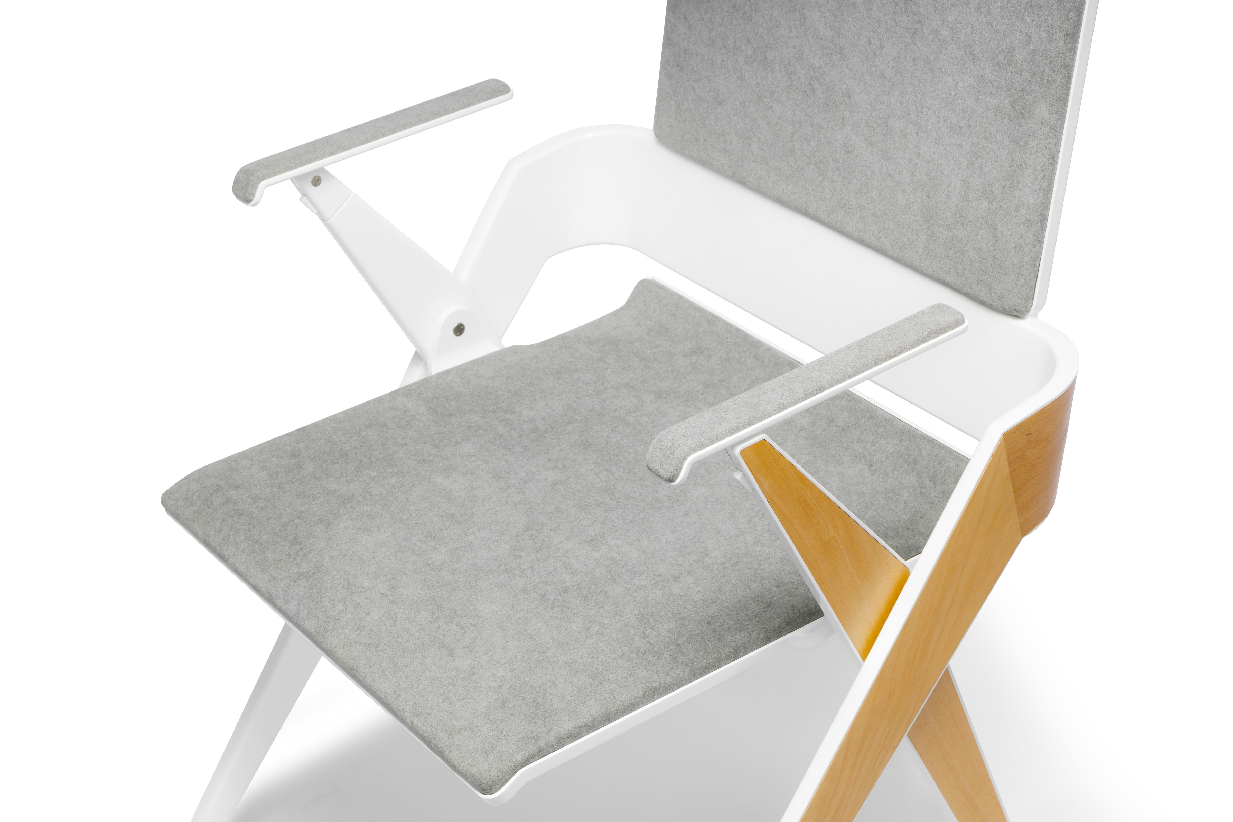 A geared mechanism concealed within the inner leg structure creates a synchronized motion with the seat and legs when folded. When the armrests are folded, the entire chair nests within the front legs making it easy to relocate to another room or store for another time.