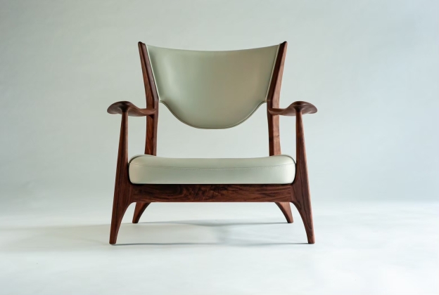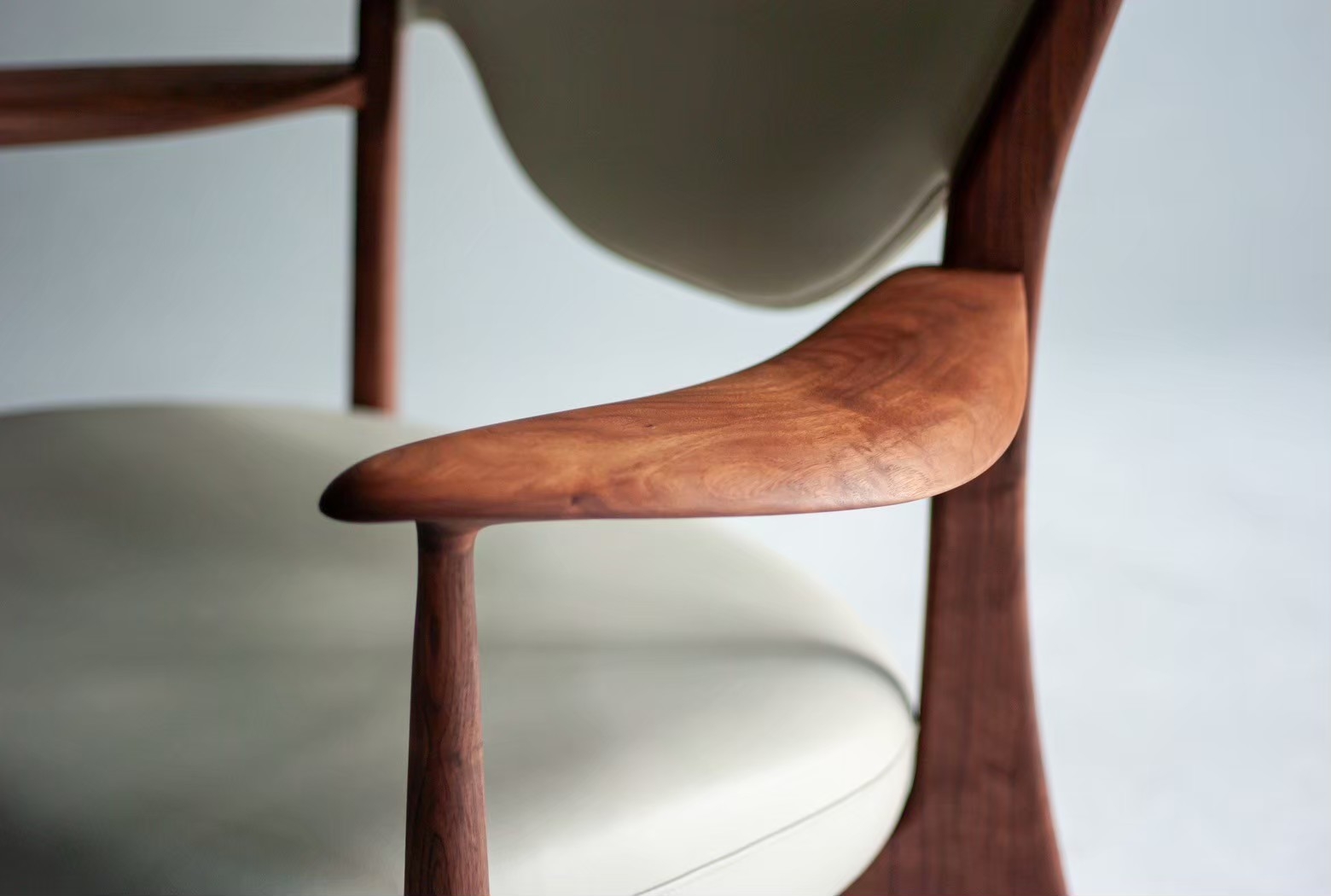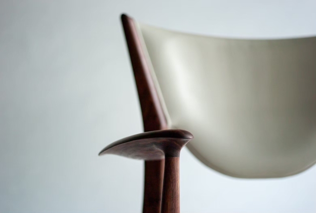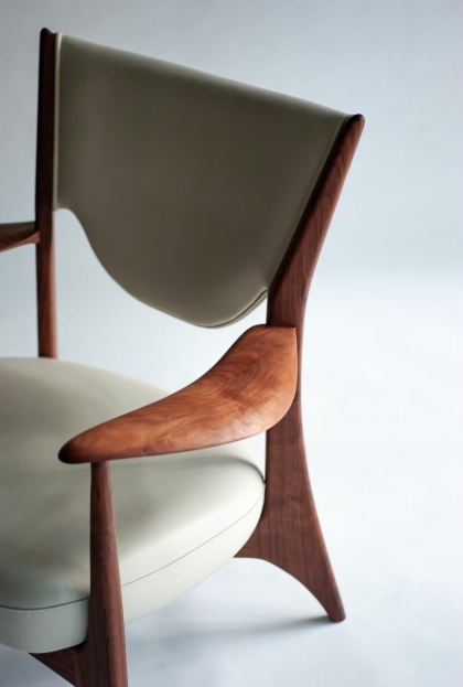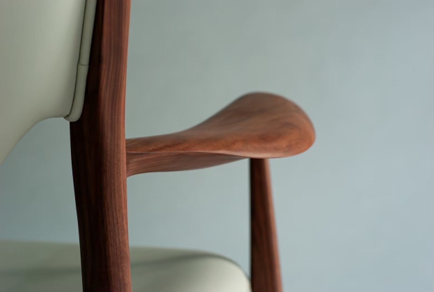 Frames and armrests are made from solid wood, hand carved by craftsmen using traditional Japanese tools. The distinctive armrests could only be expressed with blades and planes, and it is made to fit your arms perfectly.