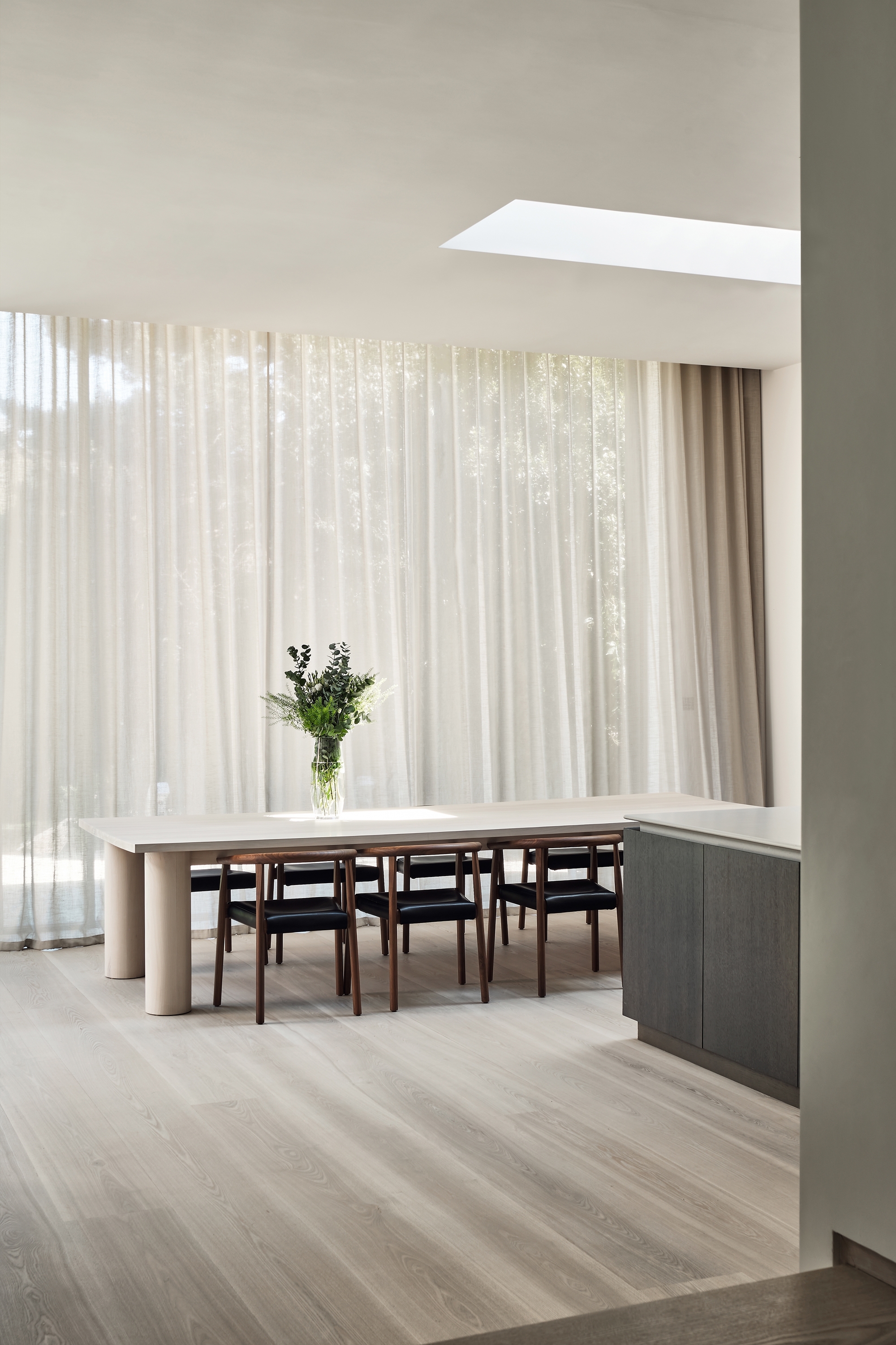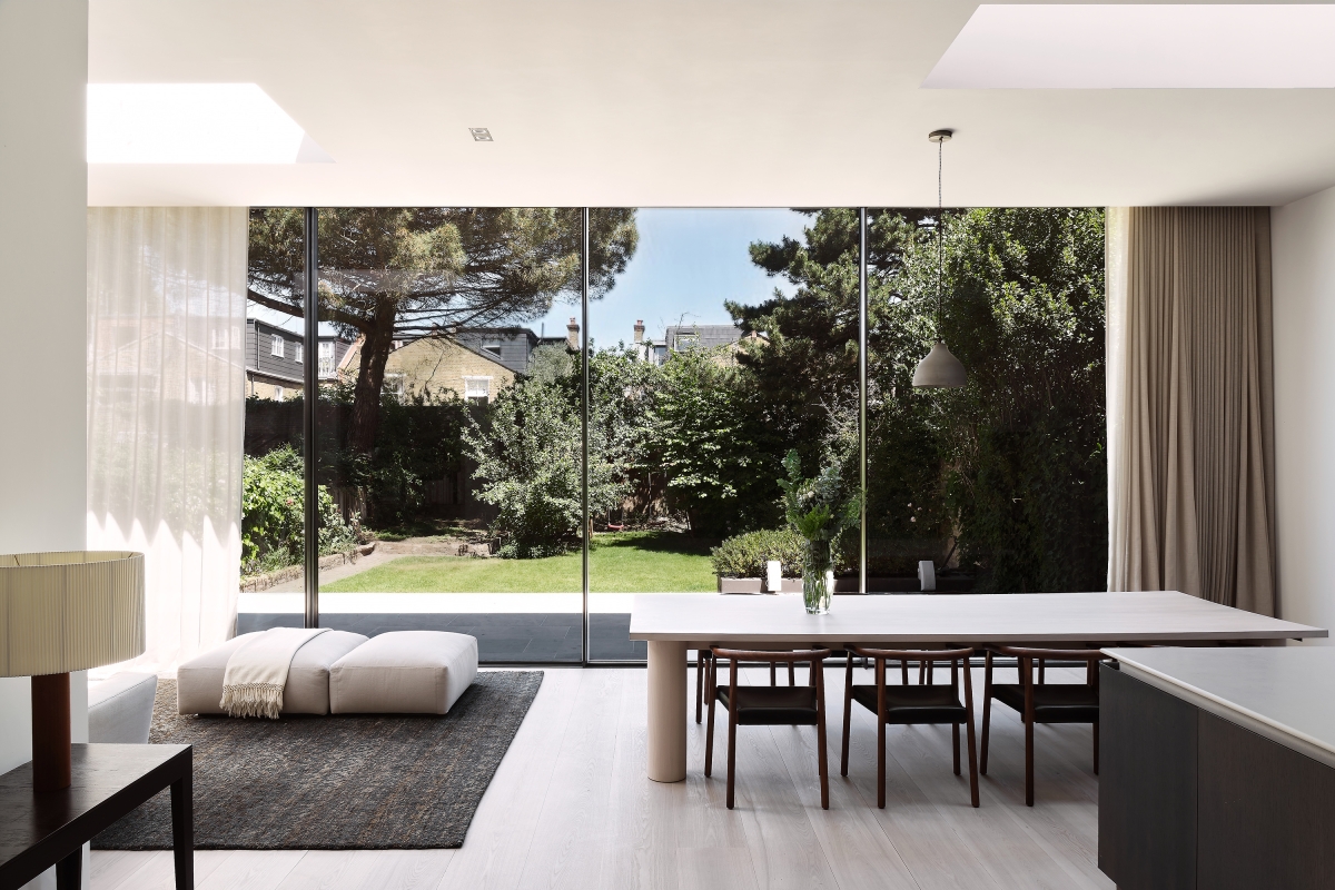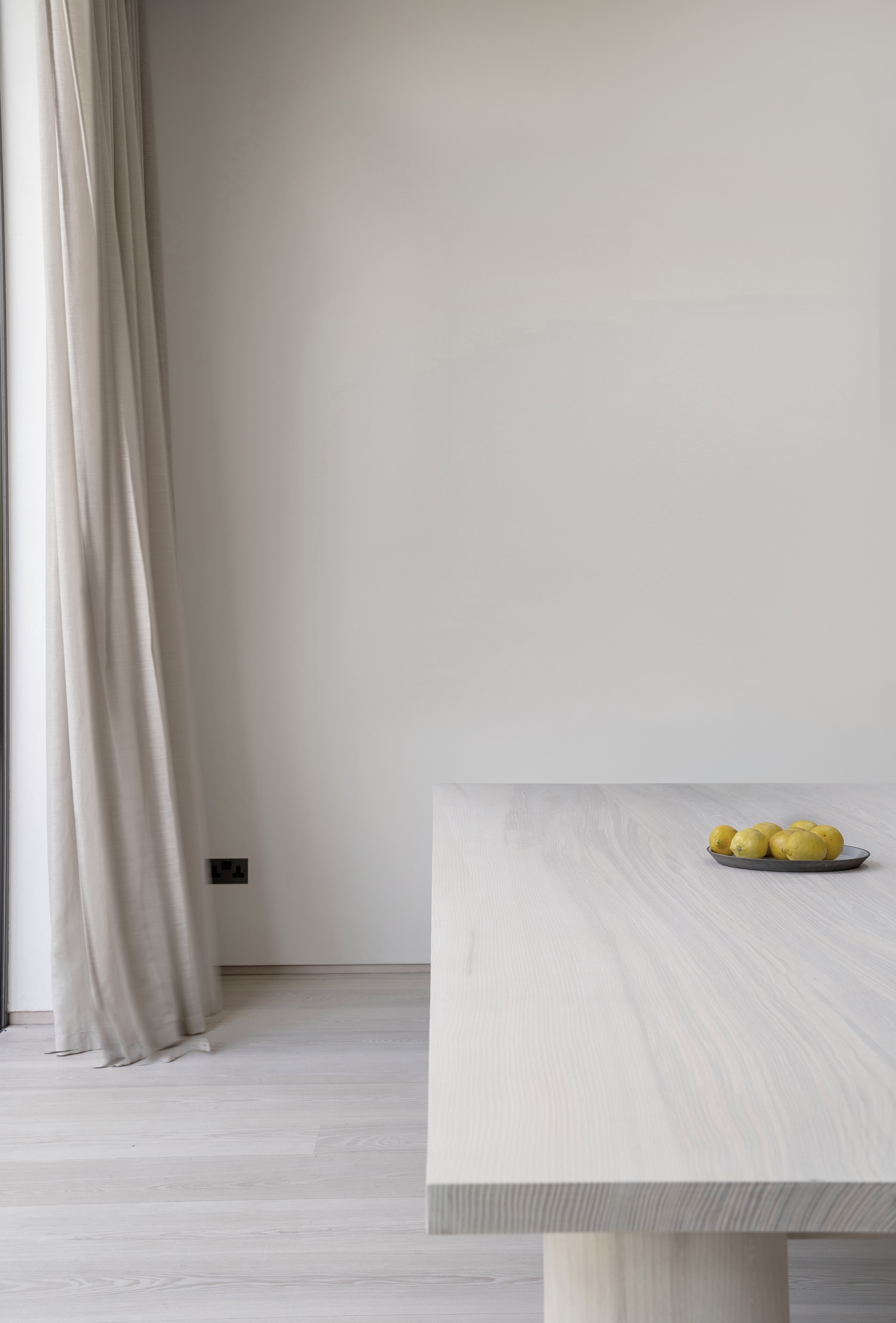 The choice of natural solid British ash wood (Dorset Ash) for the bespoke dining table was a conscious decision as a more sustainable option to other types of woods, due to its fast-growth, and self-seeding, as well as being in plentiful supply due to ash dieback in Europe. Ash trees also capture carbon from the atmosphere, storing it in the furniture for decades. The table is a key architectural centrepiece, and creates ultimate harmony with the ash Dinesen flooring through the rear extension space, as well as celebrating the future scarcity of this under used wood as a use for furniture.