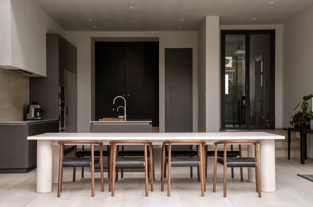 The Camille Dining Table was designed in-house, and manufactured by Benchmark as a key architectural feature to the main living space of a modern family home in Chiswick.